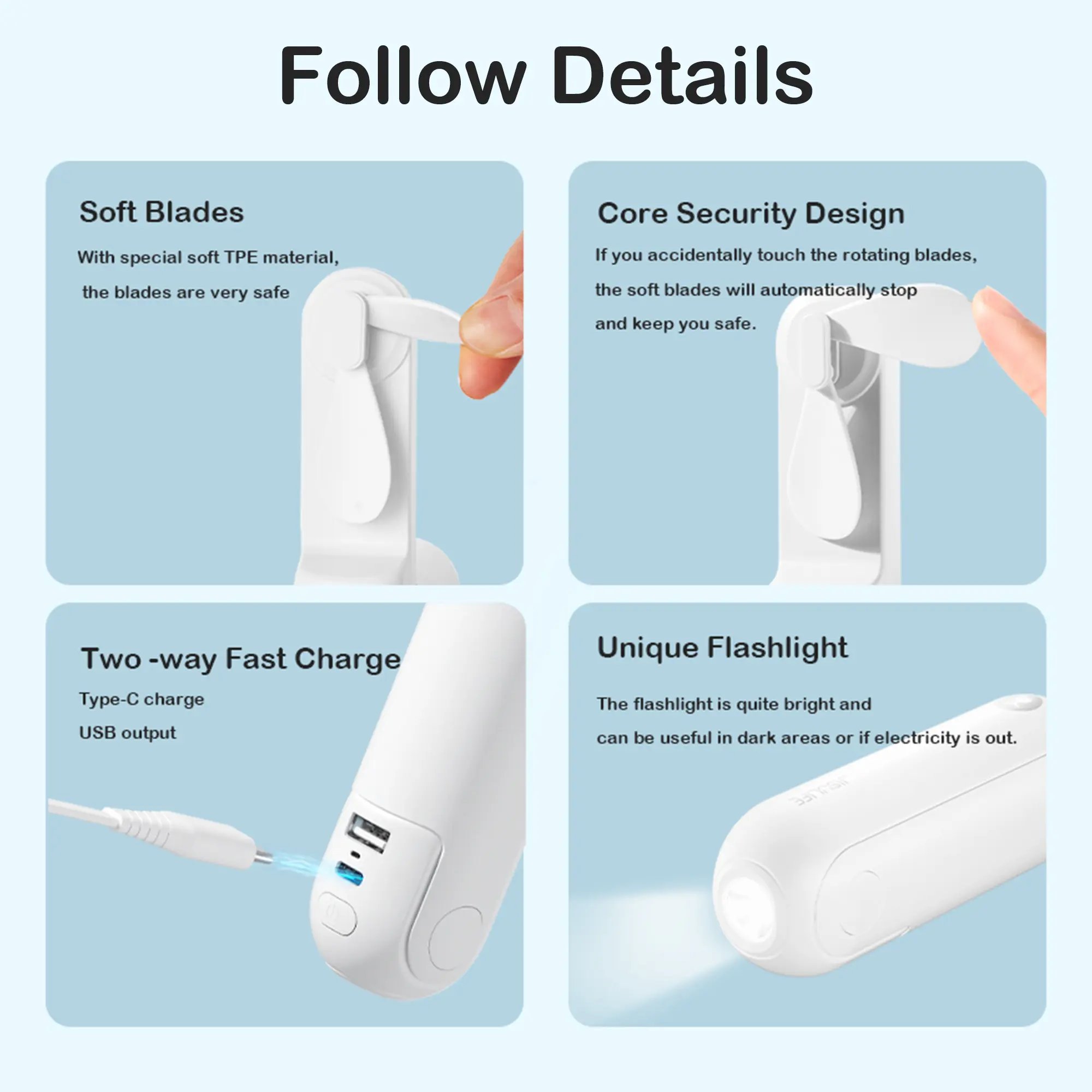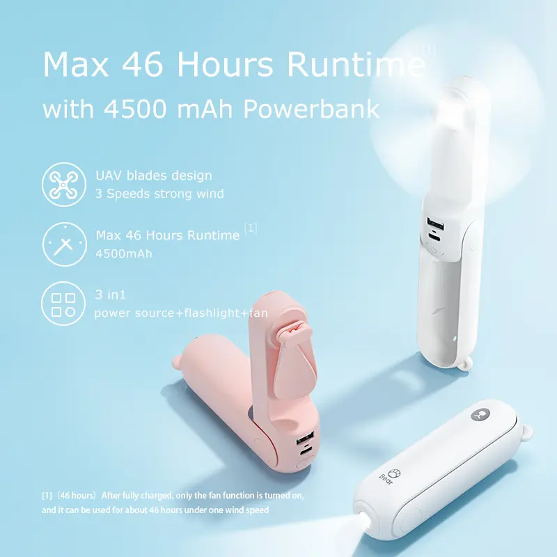 ·Long press the power button for 3s when the fan is not spinning. Then you can turn on the flashlights.