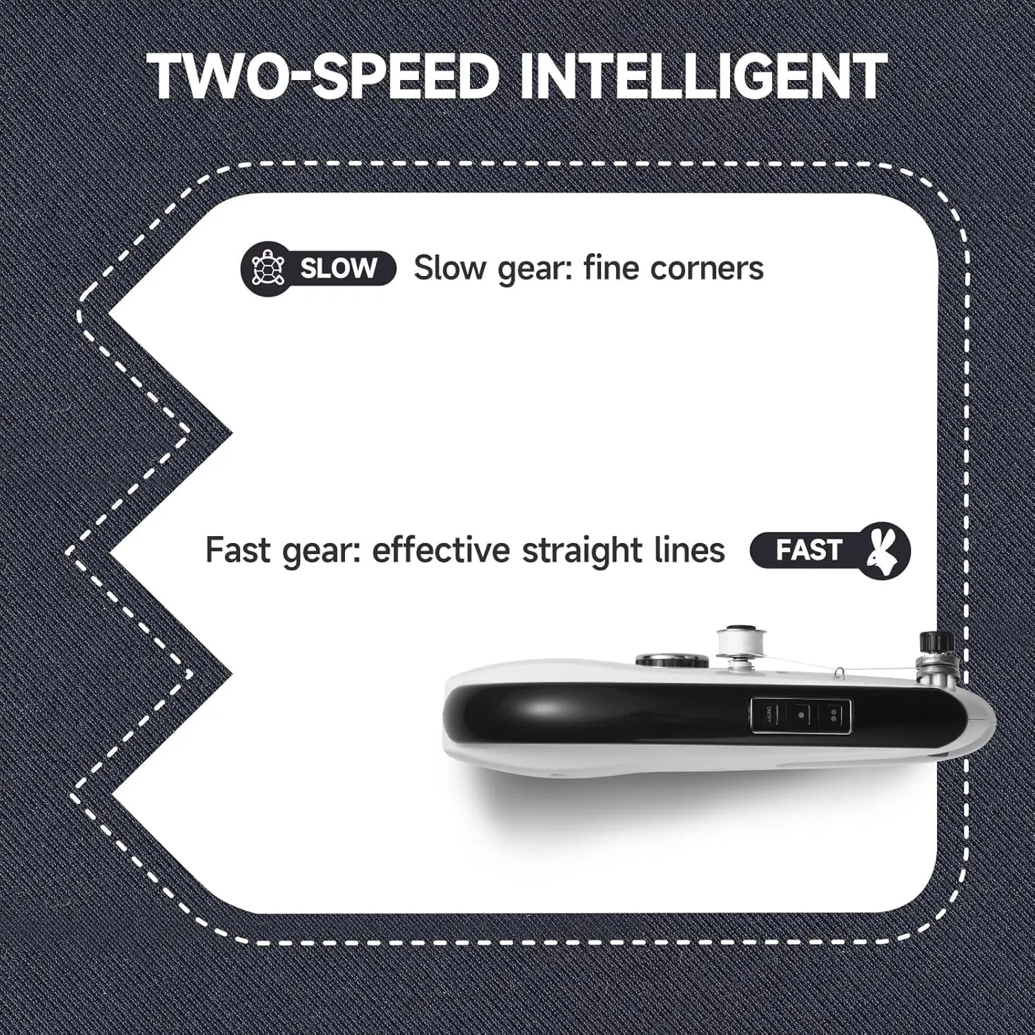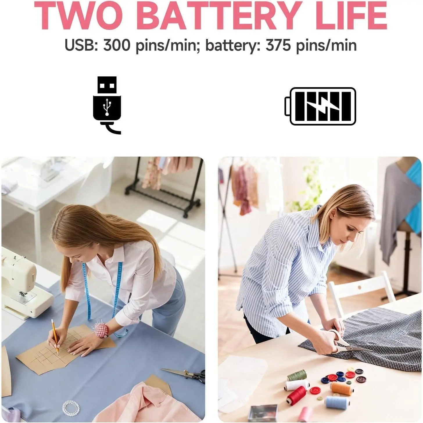 Supports two power supplies: (no coming with) and USB (coming with). The it works, the denser sewing threads are, and the stronger garments are. The seamer runs 375 times per minute while using and it performs 300 times for minute when using USB