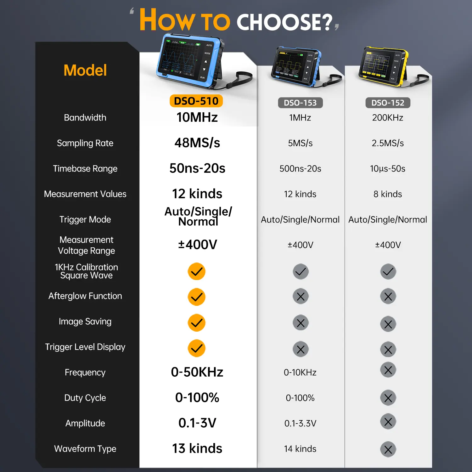 ✦ Upgraded Version: FNIRSI DSO-510 handheld oscilloscope is upgraded from FNIRSI DSO152 oscilloscope, 10 MHz high bandwidth, 48 MS/s high sampling rate, 50 ns-20 S time base range. Voltages up to 400 V can be measured.