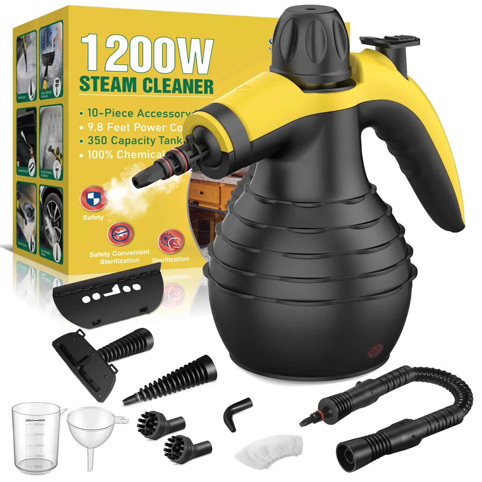 The package includes: 2 Fabric Steamer Tool, 1 Towel Sleeve, 1 Long Spray Nozzle, 1 Window/Door Cleaning Tool, 1 Measuring Cup, 1 Funnel, 1 Handheld Steam Cleaner, 1 Extension Hose, 2 Brush Heads, 1 Bent Nozzle. Product Dimensions: 9.84"D x 9.06"W x 7.87"H.