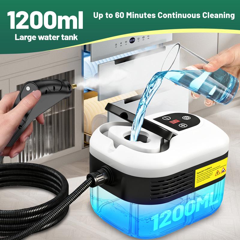 Equipped with a 1200ml (40.6oz) water tank, this steam cleaner runs for up to 60 minutes on a single filling, eliminating the need for frequent refills. Say goodbye to interruptions and focus on cleaning with ease.