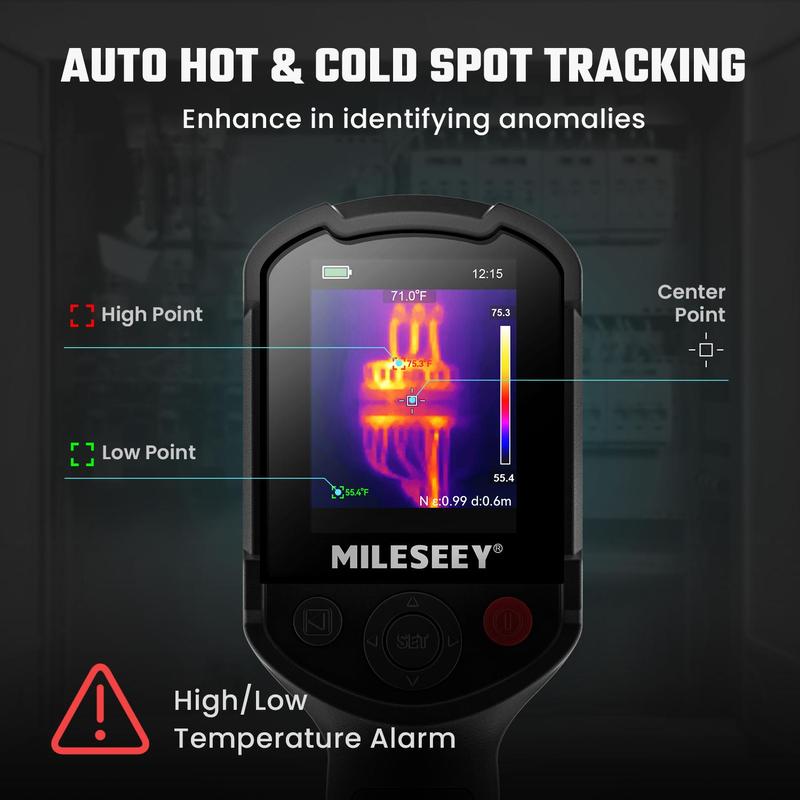 Equipped with a High/Low Temperature Alarm, the TR10 alerts users to extreme temperatures. With high thermal sensitivity (NETD) and a wide range (-4°F to 1022°F), it delivers accurate readings within ±2°C. It automatically displays max, min, and center-point temperatures, pinpointing hot spots with precision.