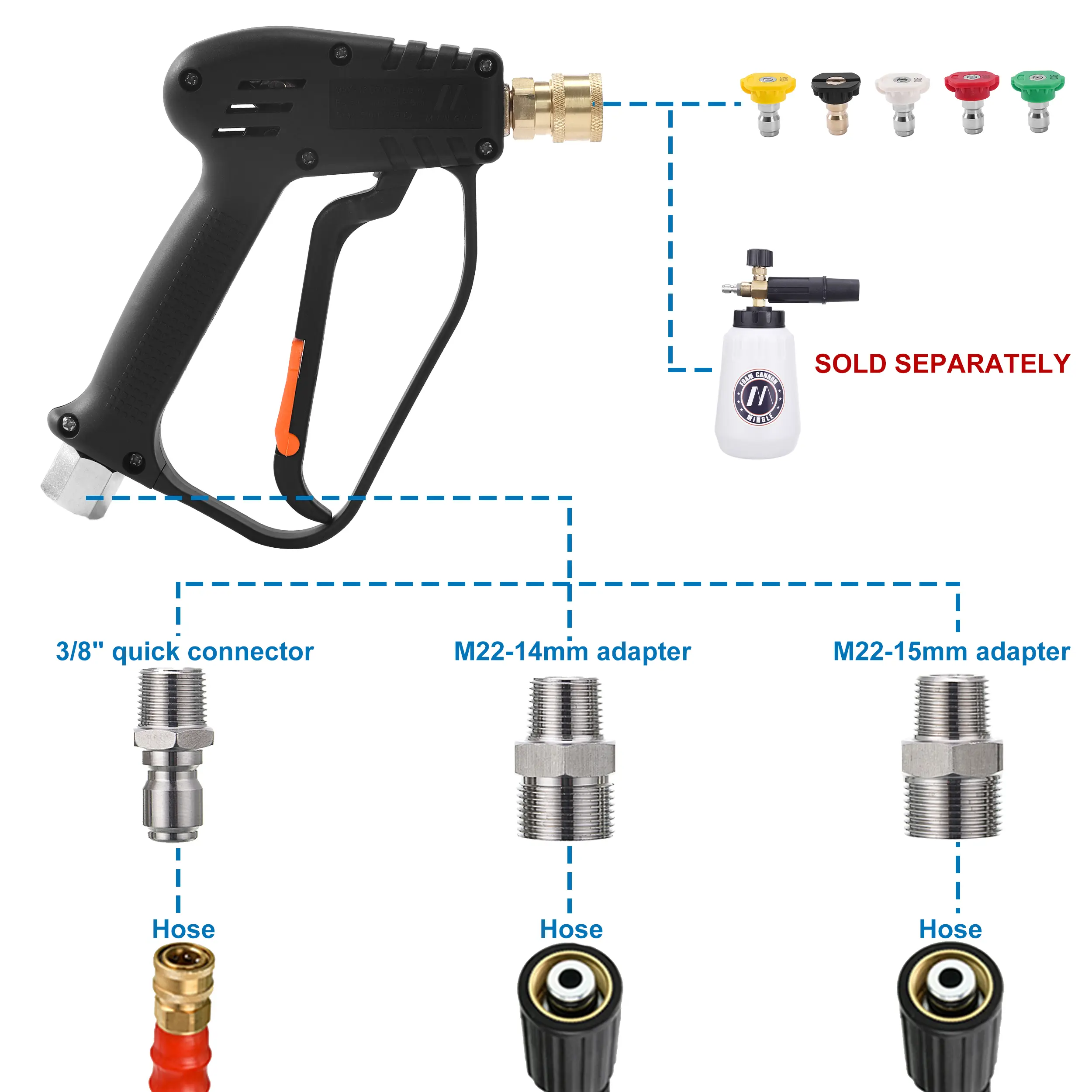 ·【Wide Applicability】The high handheld water jetting tool with swivel comes with 3 fitting adapters: 3/8'' quick couplings, M22-14mm fittings and M22-15mm fittings, which are compatible with most pressure washer hoses.