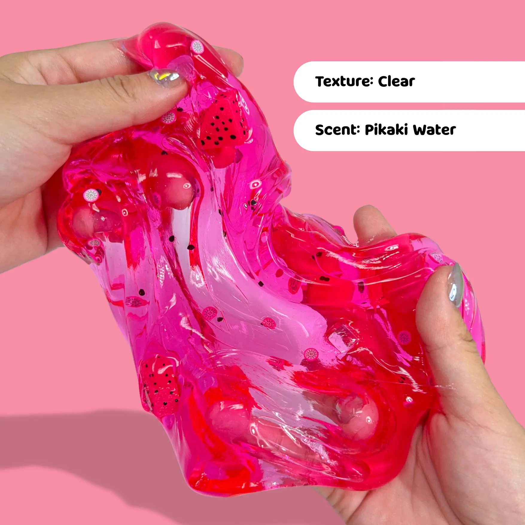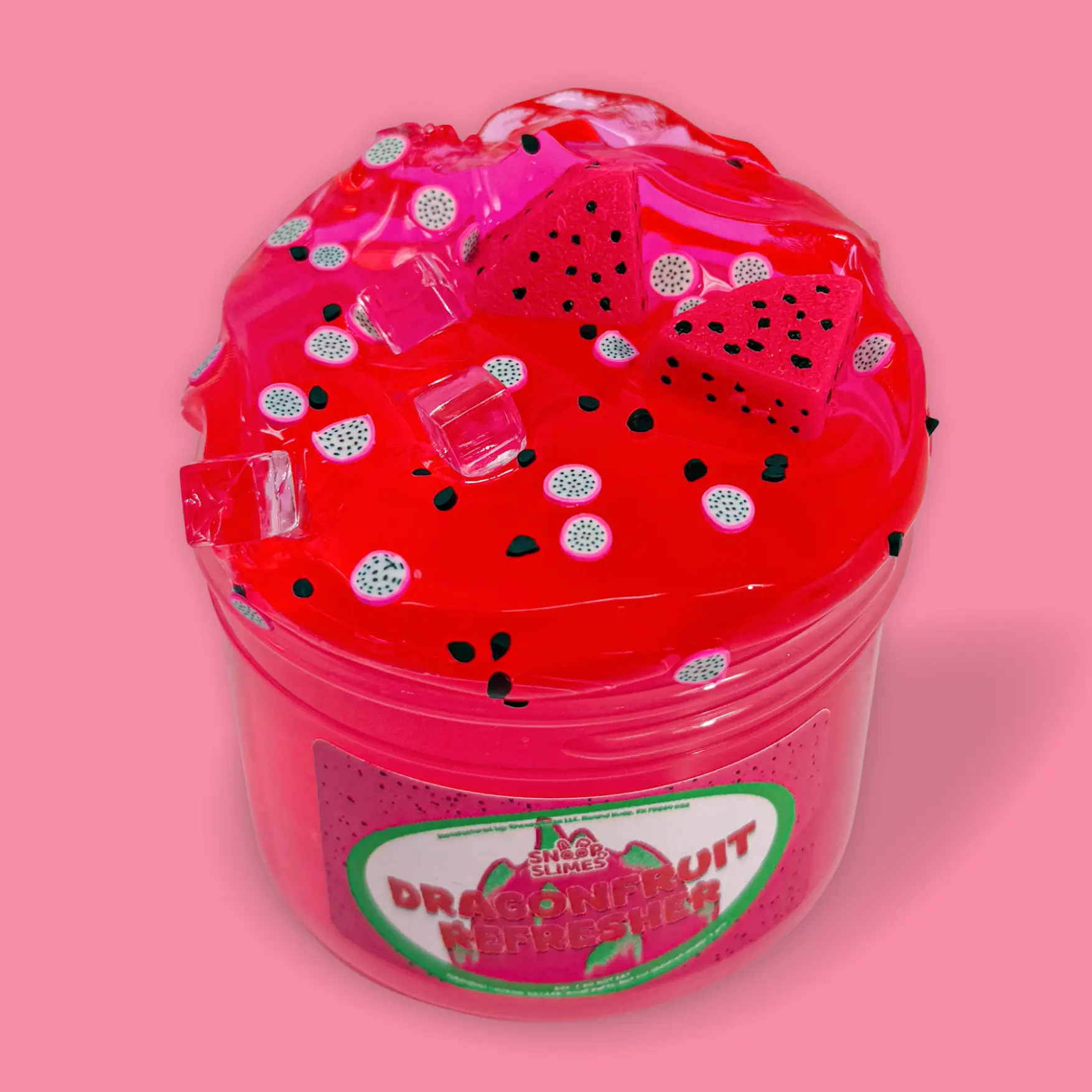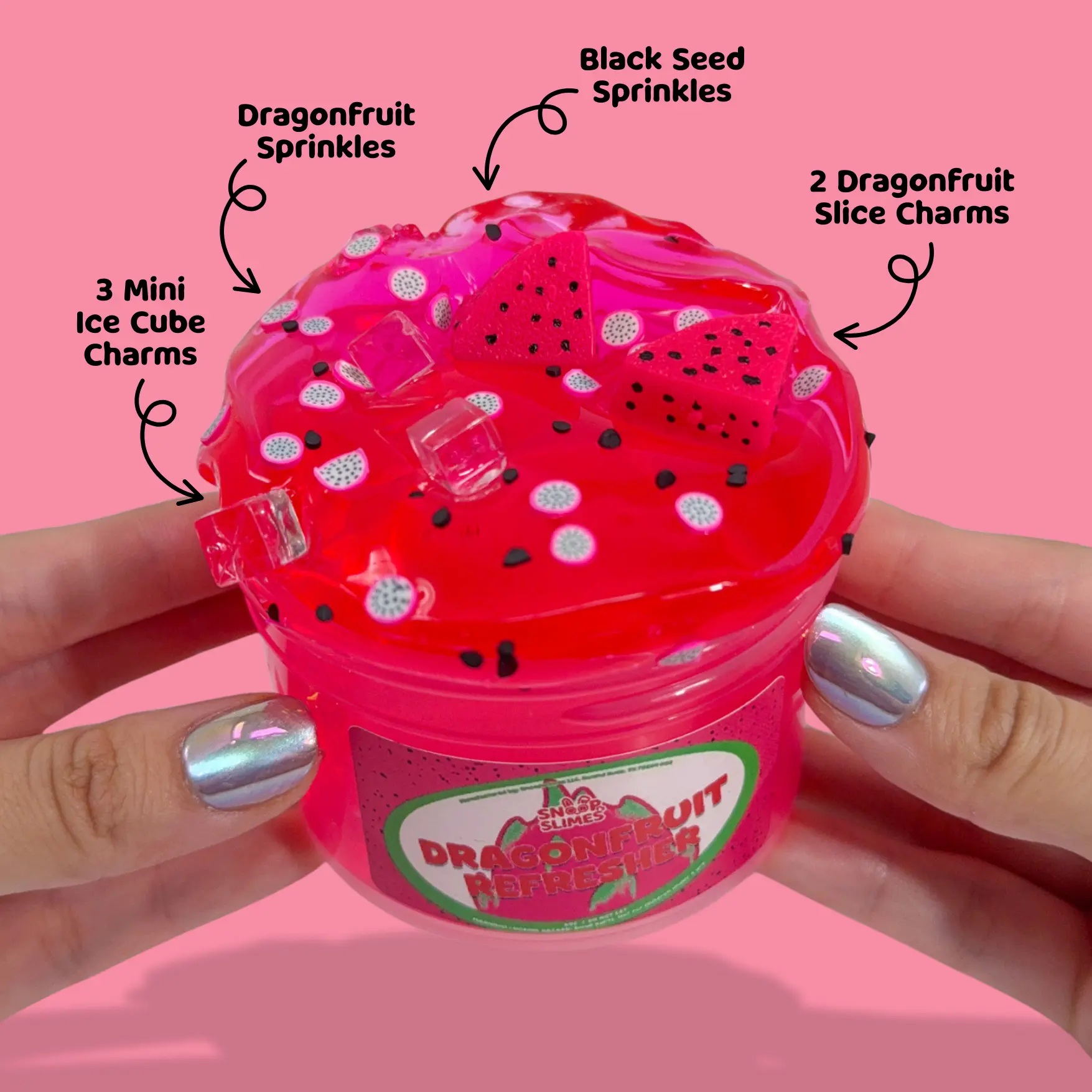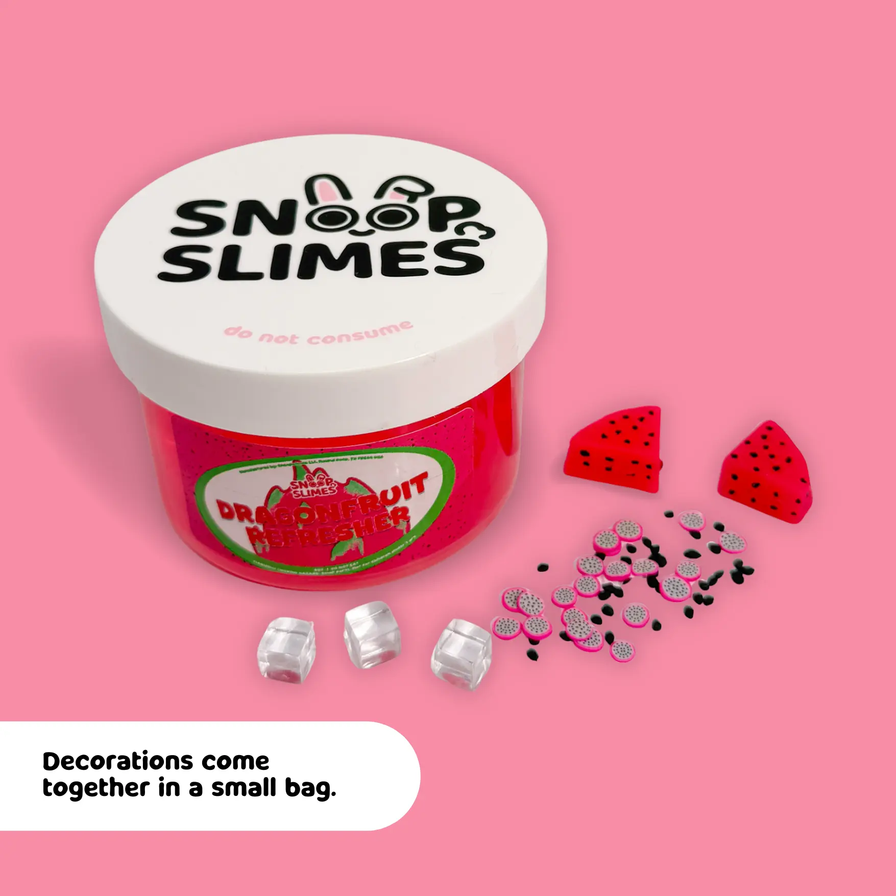 What’s Included: 6oz Dragonfruit Refresher Clear Slime Base  2 Dragonfruit Slice Charms 3 Mini Ice Cube Charms Dragonfruit Sprinkles Black Seed Sprinkles