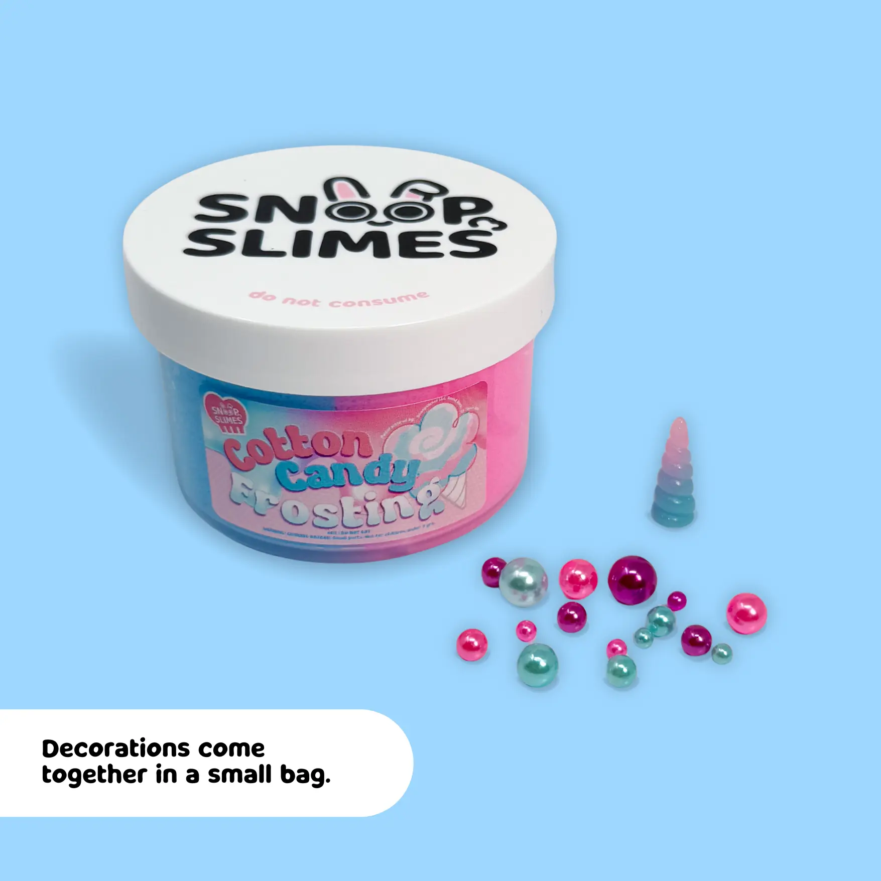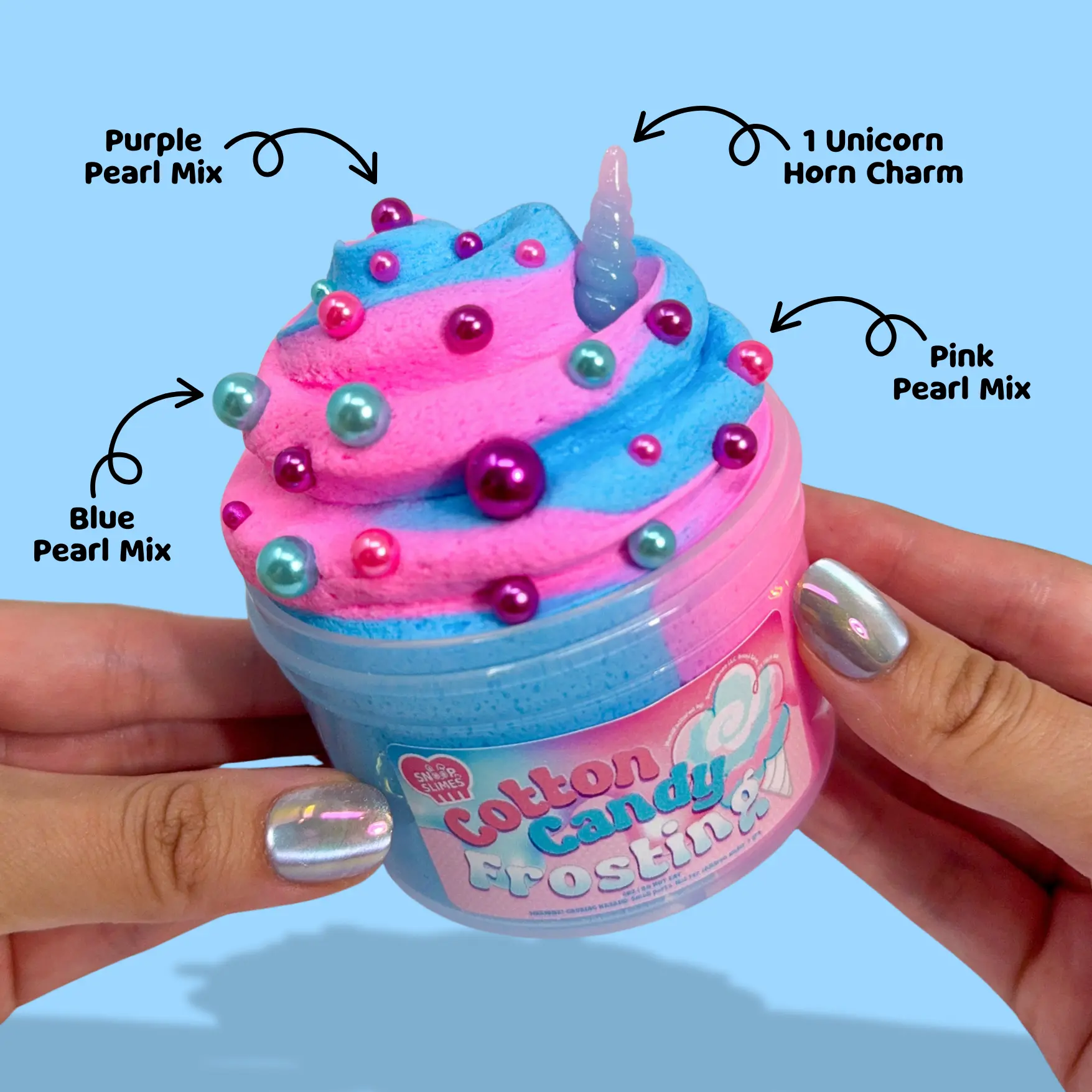 What’s Included: 6oz Cotton Candy Frosting Buttercream Slime Base 1 Unicorn Horn Charm Pink Pearl Mix Blue Pearl Mix Purple Pearl Mix