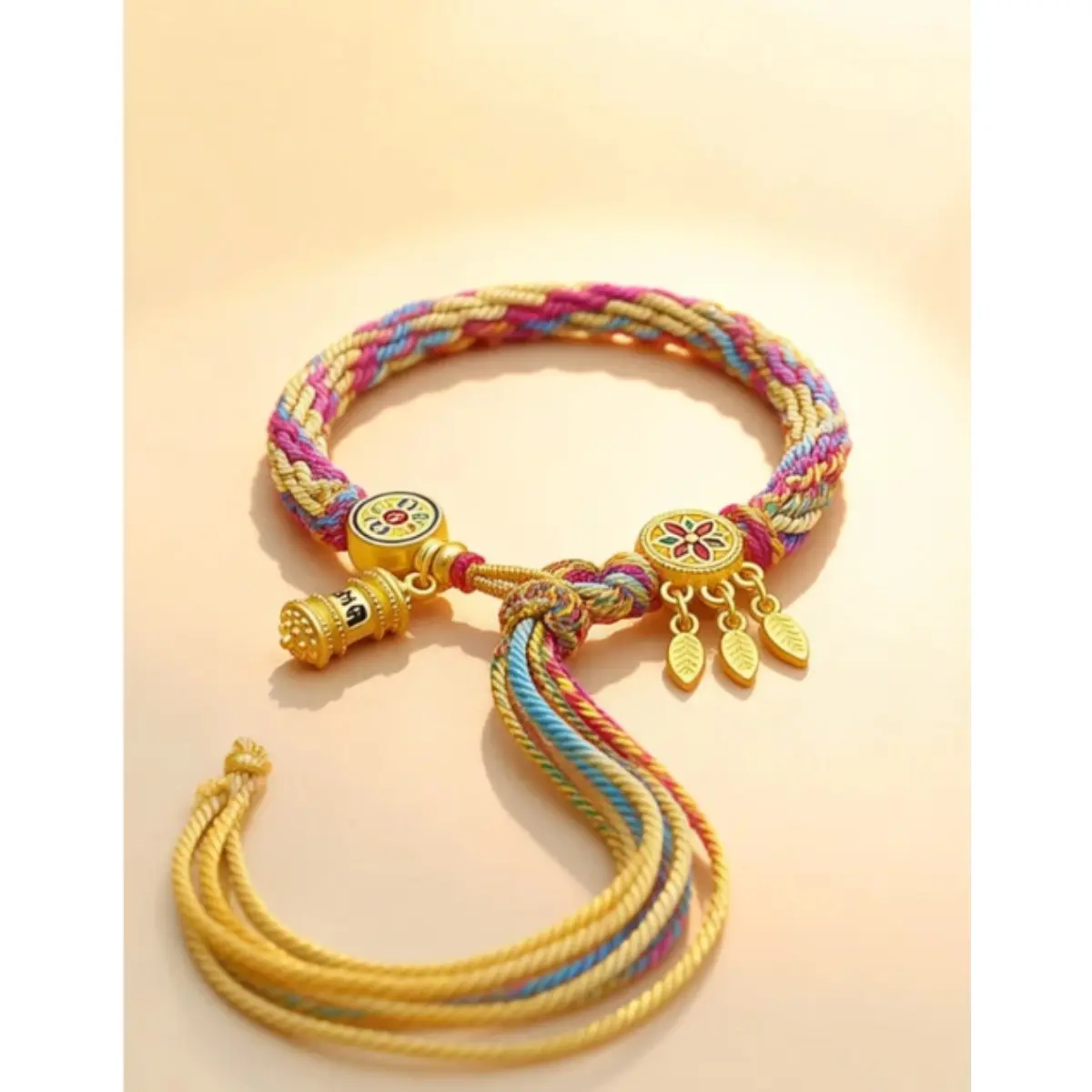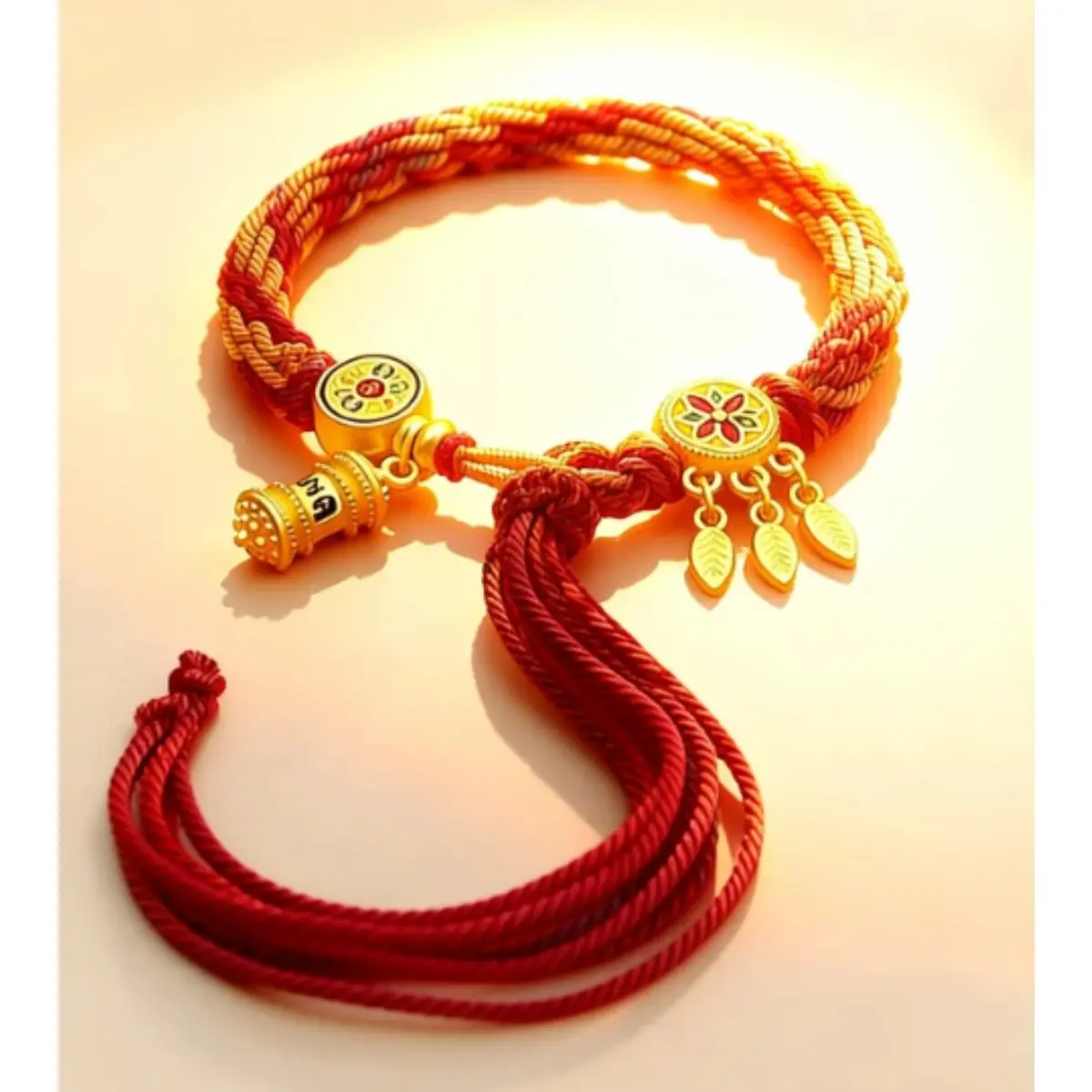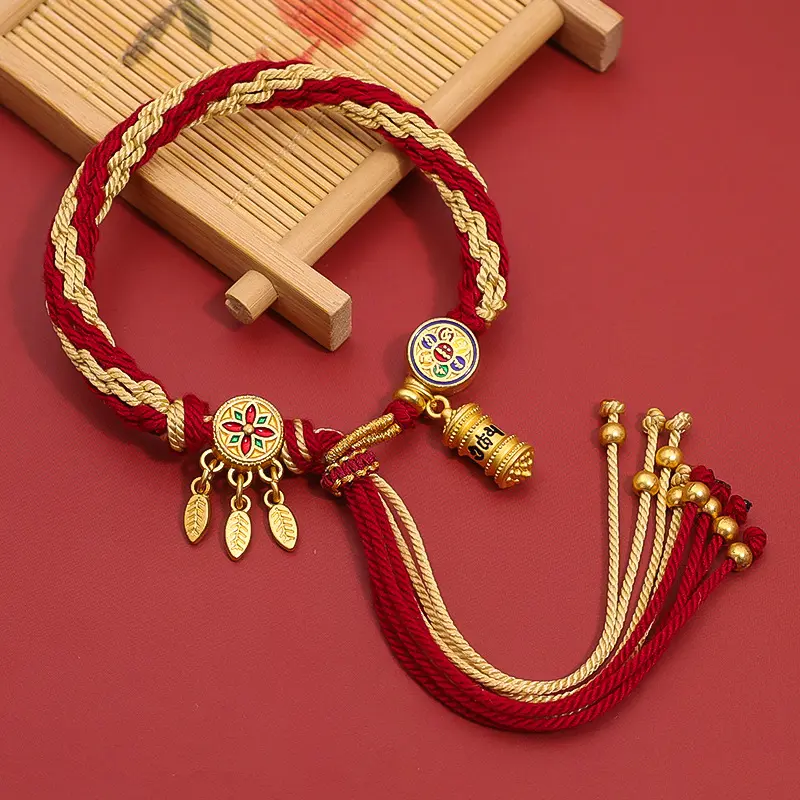 At the heart of the bracelet sits a detailed golden charm engraved with traditional symbols of luck and wealth, paired with two delicate leaf pendants that symbolize growth and continuous prosperity. Every knot and thread is braided by hand, infusing the piece with intention and care that mass-produced jewelry can’t match. Whether you’re navigating a busy workday, stepping into a new opportunity, or simply seeking to ground your energy, this bracelet acts as a tangible reminder of your goals.