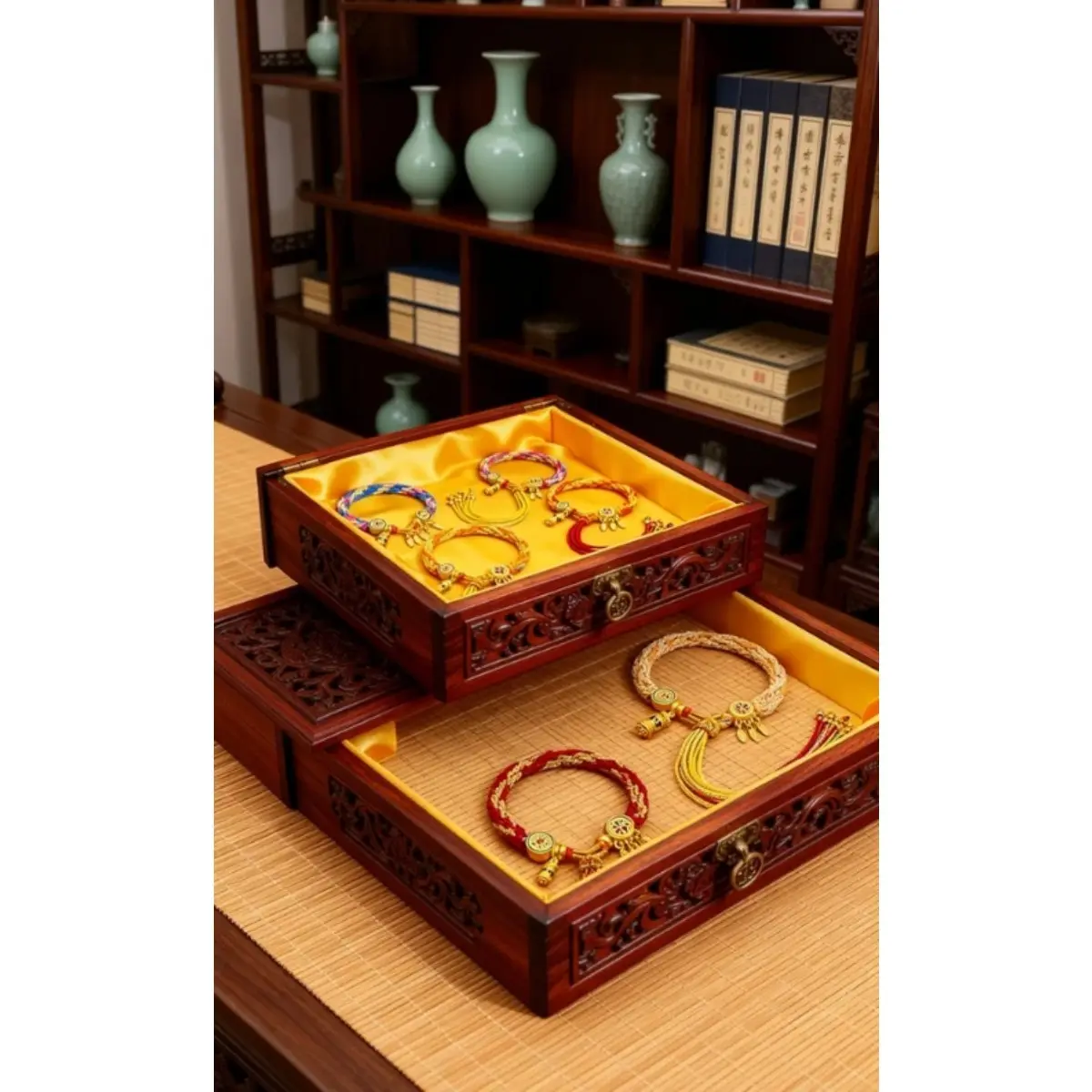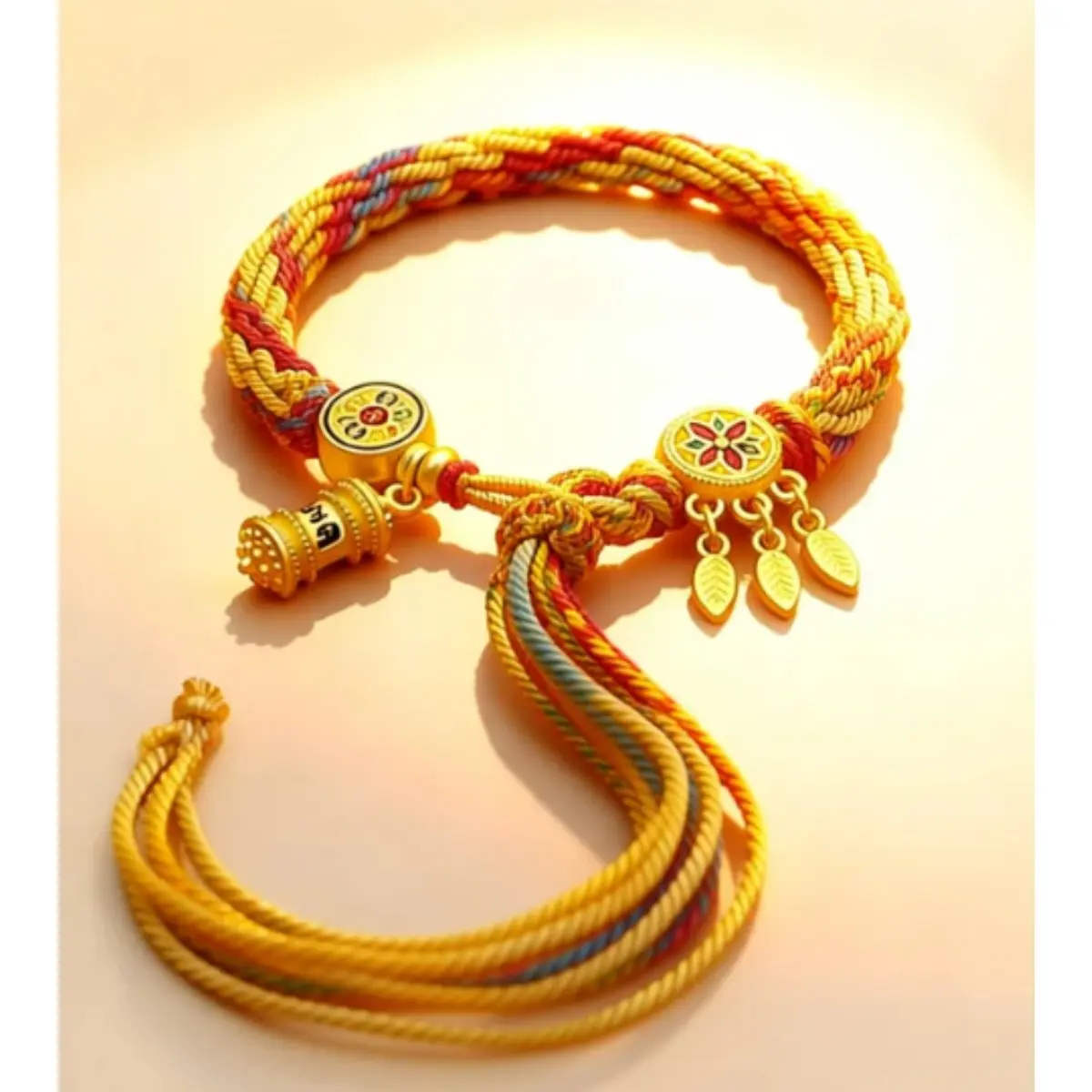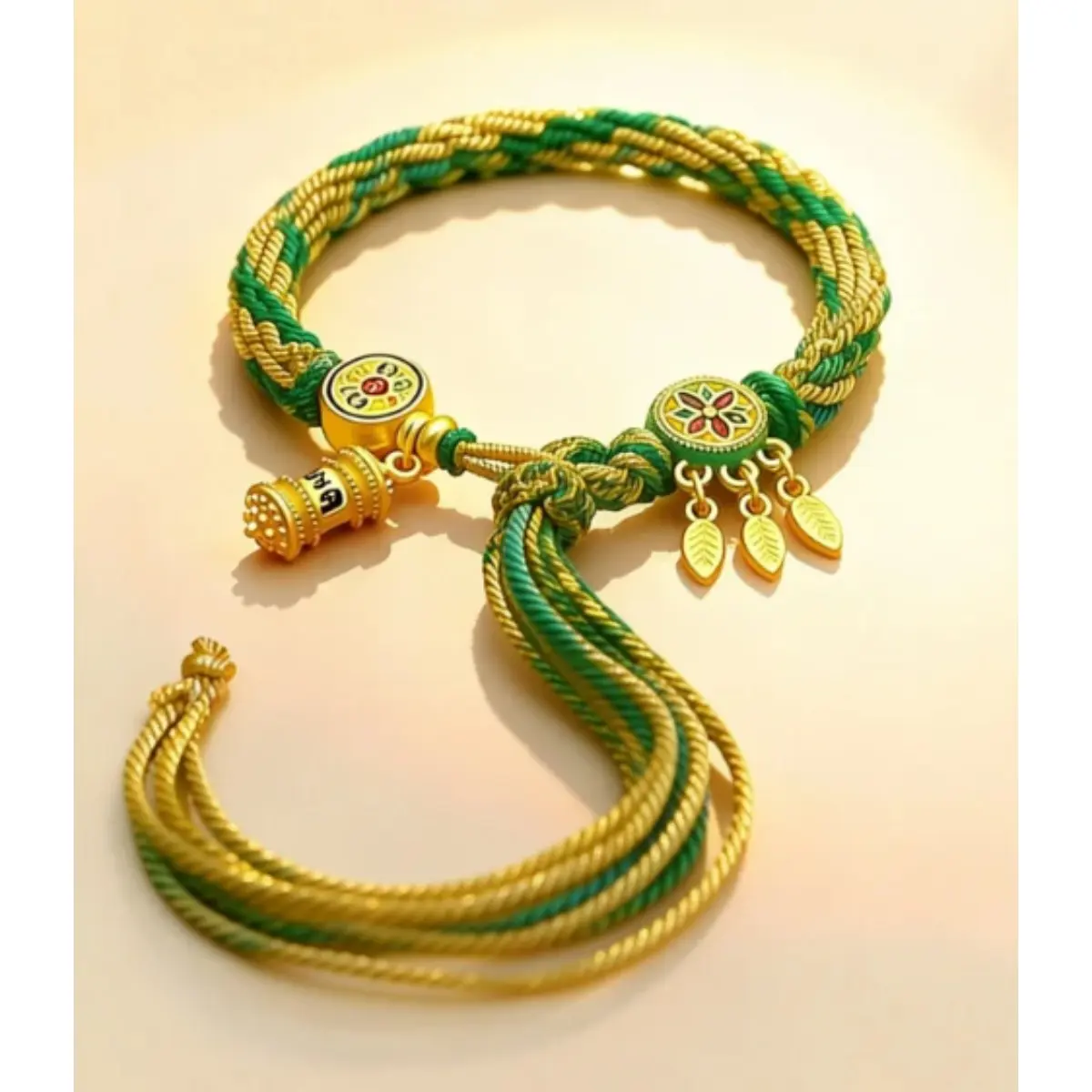 At the heart of the bracelet sits a detailed golden charm engraved with traditional symbols of luck and wealth, paired with two delicate leaf pendants that symbolize growth and continuous prosperity. Every knot and thread is braided by hand, infusing the piece with intention and care that mass-produced jewelry can’t match. Whether you’re navigating a busy workday, stepping into a new opportunity, or simply seeking to ground your energy, this bracelet acts as a tangible reminder of your goals.