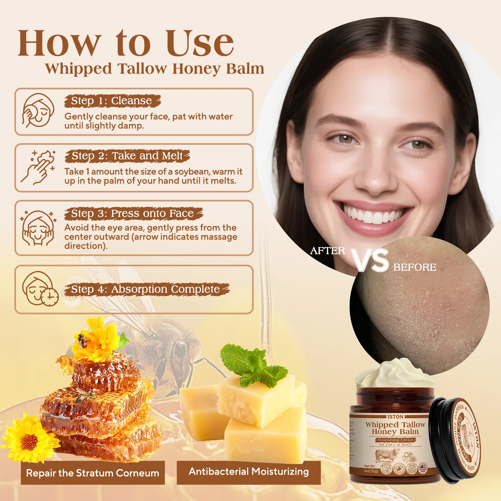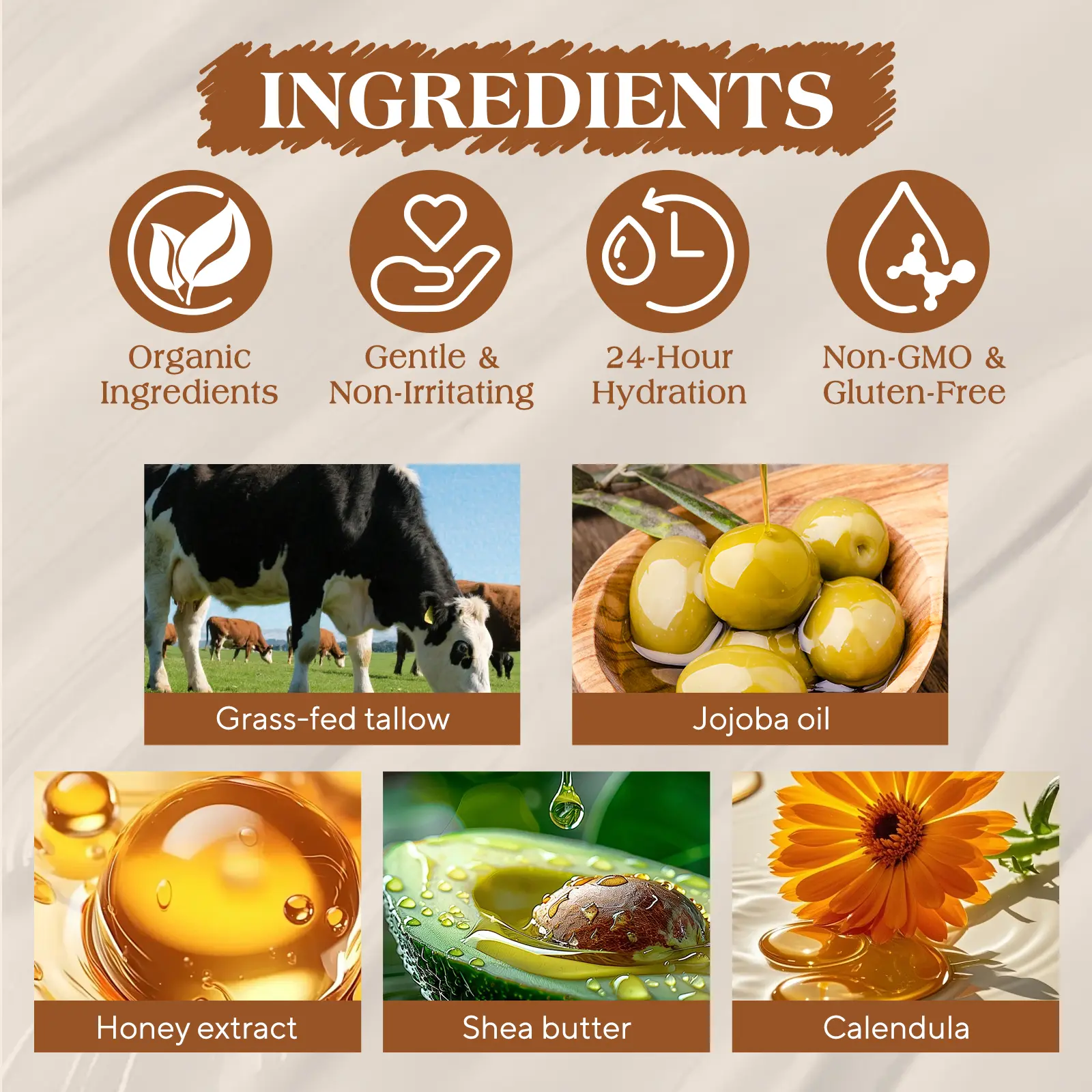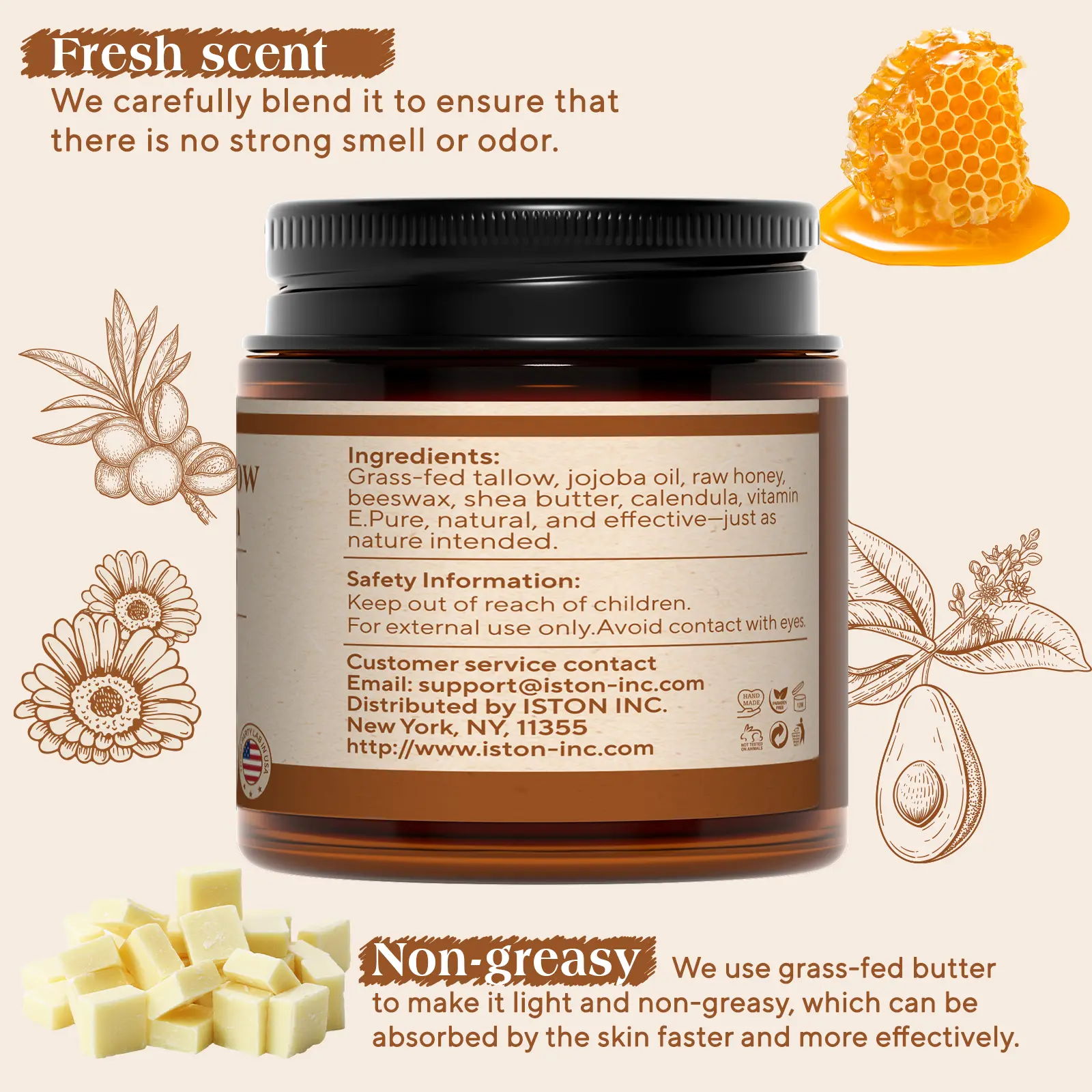 Superior quality assurance - Purely handmade, restores the natural taste. Adhere to the highest standards for every ingredient in our products. We carefully craft it with the finest grass-fed beef tallow, olive oil and raw honey. Through a meticulous refining and clarification process, only pure beef tallow is produced, ensuring that every jar reaches the highest standards of excellence.