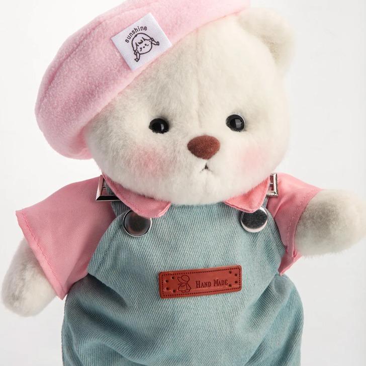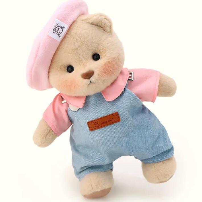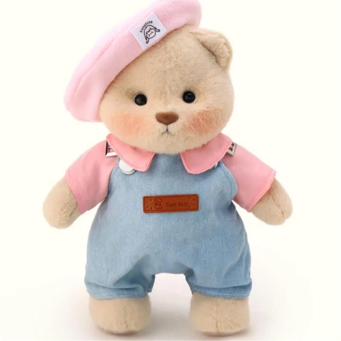 Meet the Getahug Pink Beanie Oueralls Bear! This charming handmade teddy bear comes dressed in blue overalls and a pink shirt. Perfect as a gift, it's a delightful addition to any collection. The bear's design is simple yet captivating, making it a cherished companion.