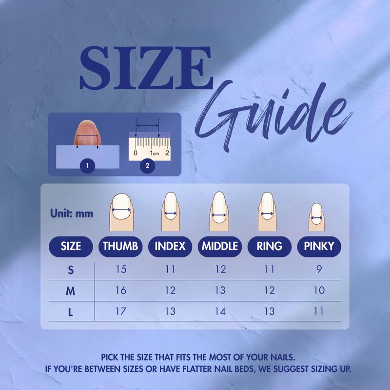 I purchased a size SMALL. They arrived in cute packaging. A cuticle pusher, nail file, glue and an air freshener. The nail beds are very small but they look so amazing on !!!! They legit look like I got them professionally done. I may get the medium next but I adore them. I love the color! Get them!