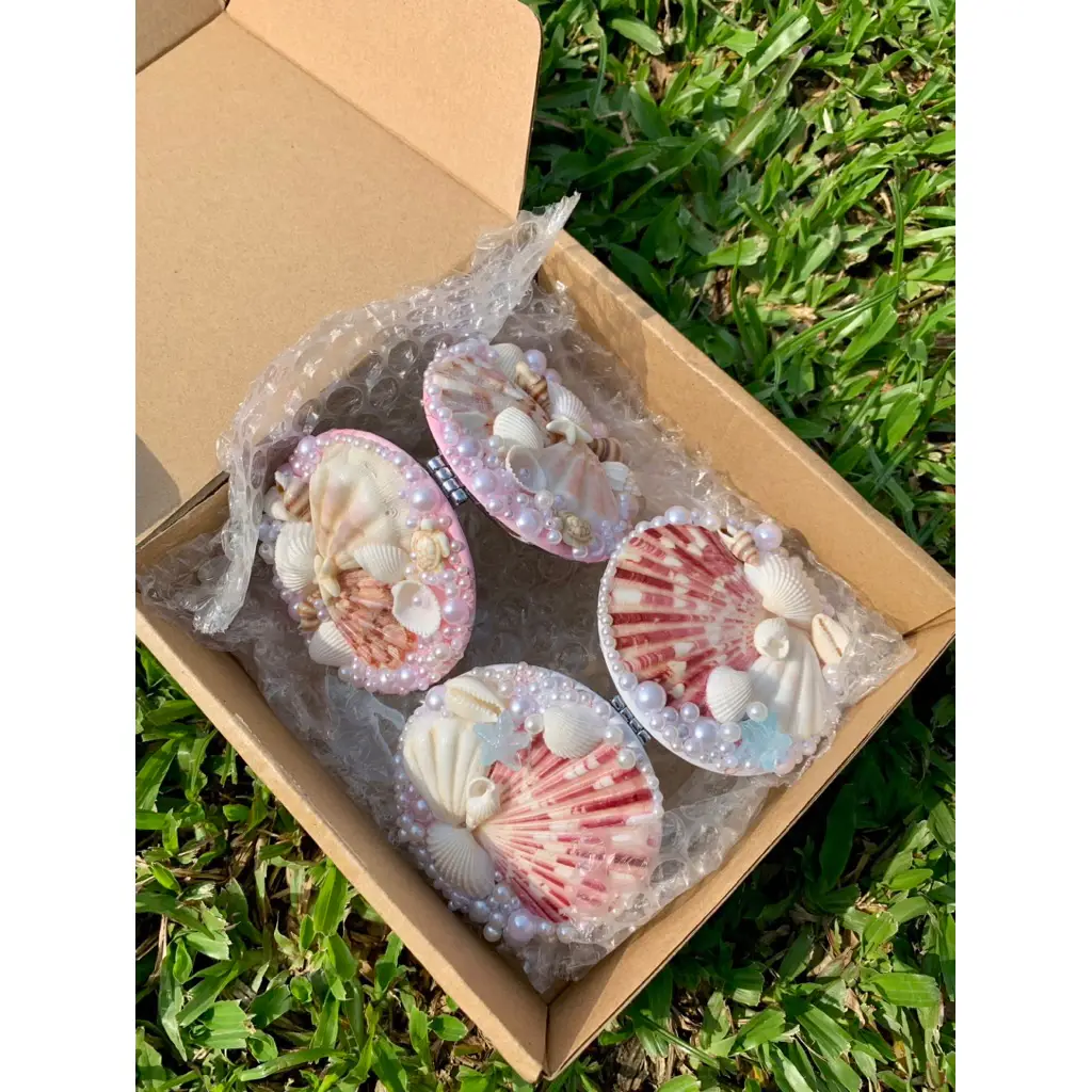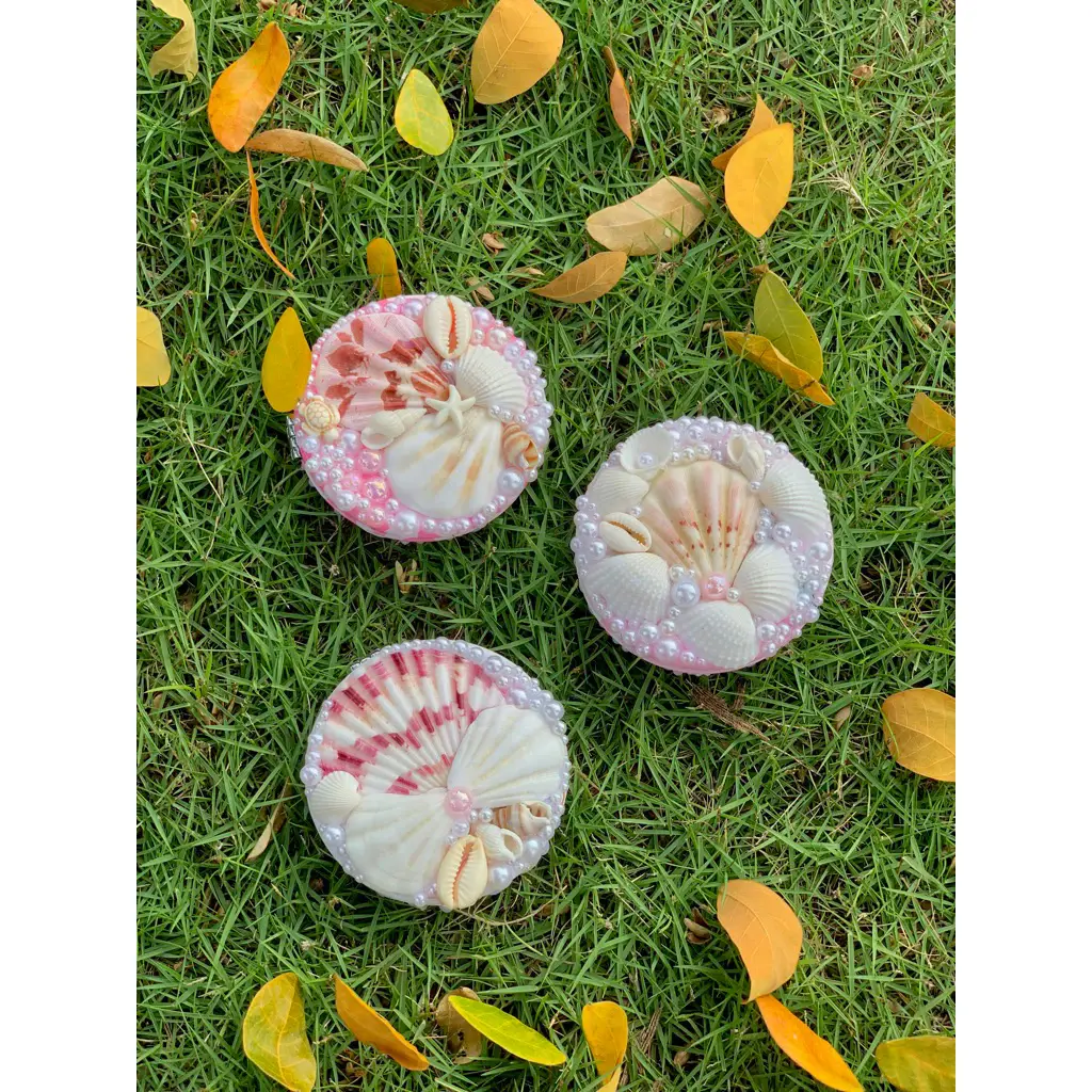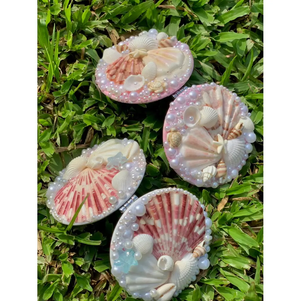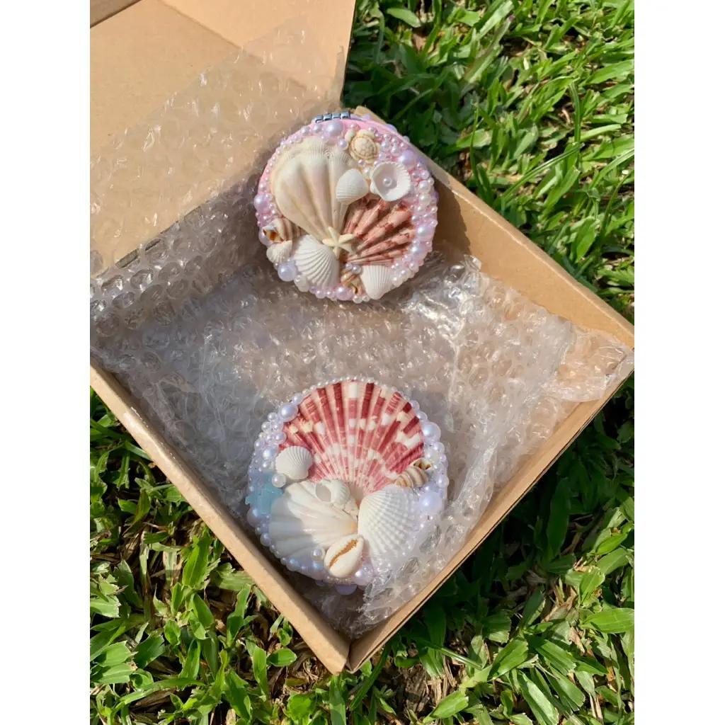 This adorable double-sided compact mirror is carefully handcrafted using real seashells, delicate pearls, and charming ocean details. Each piece is uniquely designed, making it a one-of-a-kind accessory just for you.