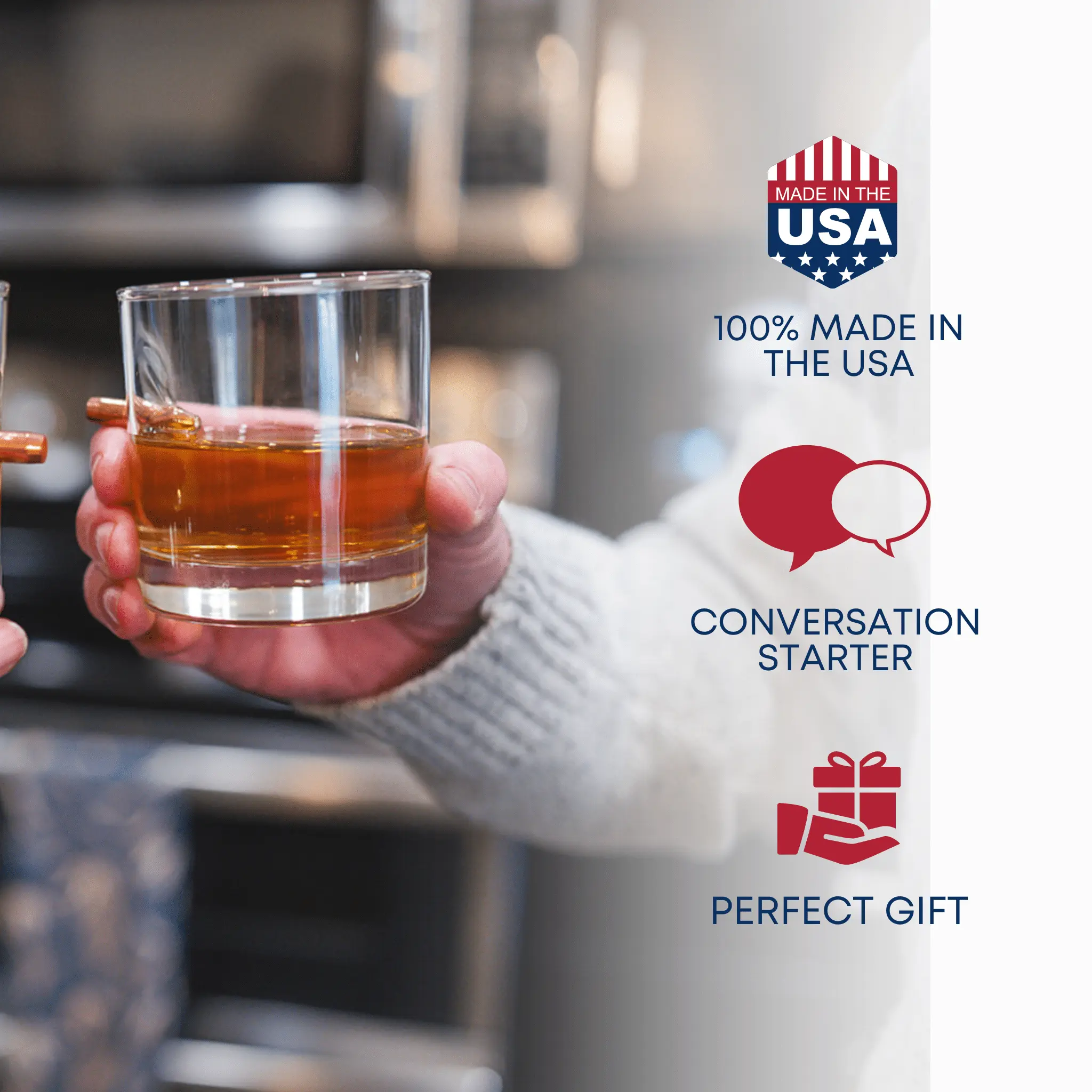 Every glass is handmade one at a time in their glass workshop in Wisconsin. These whiskey glasses are made with high-quality materials, and all packaging and raw materials are sourced from the USA. Each bullet is precision-engineered by Lehigh Defense in Quakertown, Pennsylvania, ensuring quality and durability. 100% Made in the USA.