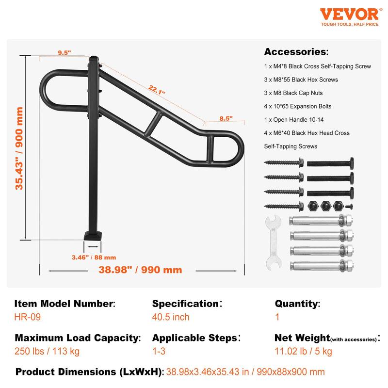 5. VEVOR Single Post Handrail for Outdoor 1-3 Steps, 40.5" L x 35.4" H Metal Bent Stair Handrails, Floor Mounted Carbon Steel Stair Railing, U-Shaped Post Grab Rails with 2 Anti-Skid Crossbar for Garage