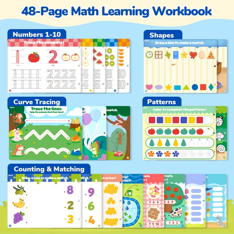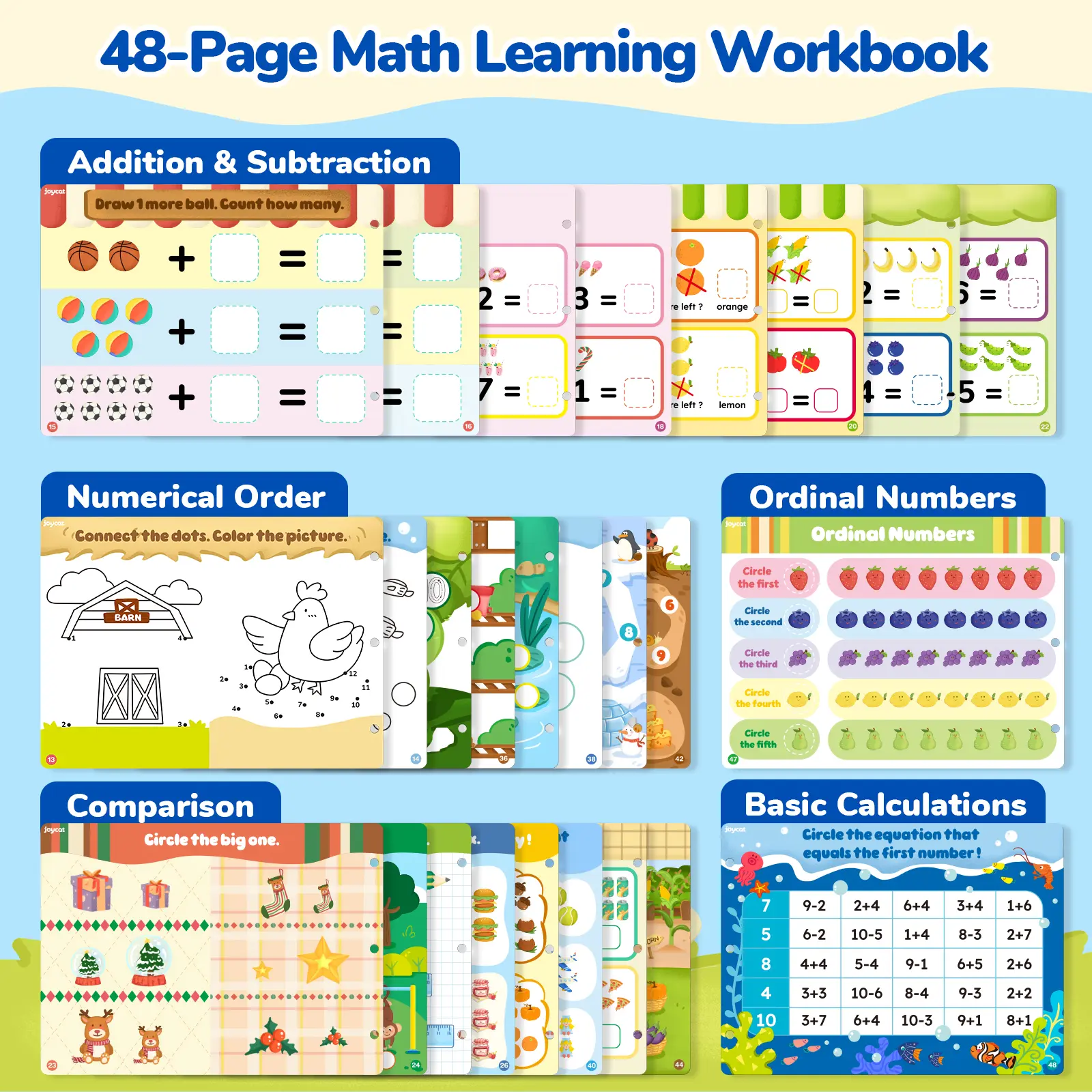The JoyCat Math Workbook Set contains: 1 reusable math activity book (48 learning pages with 10+ math themes), 10 dry-erase markers, 1 cleaning cloth, and 1 storage bag for easy organization.