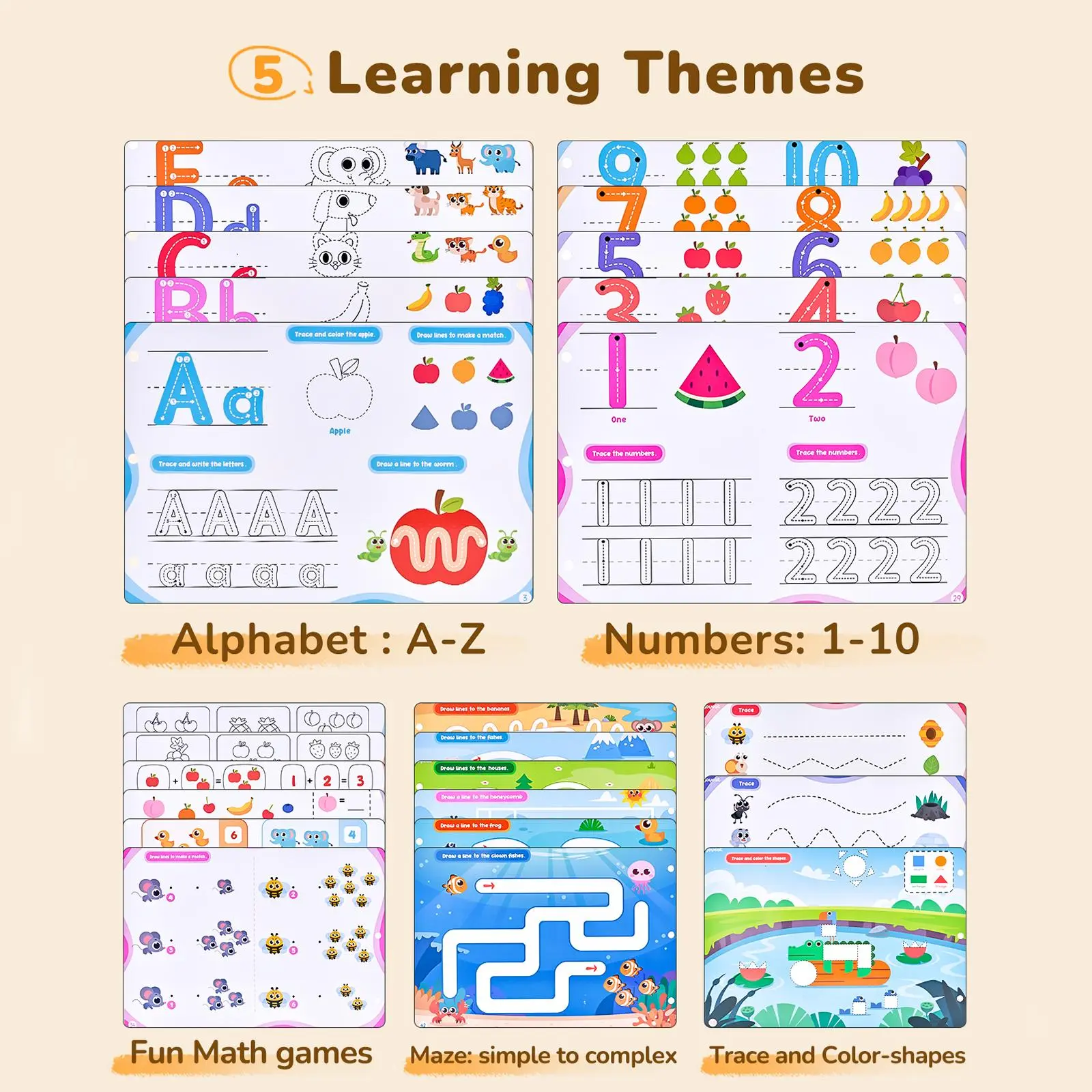 Contains line tracing, 26 upper and lower case letters of the alphabet, 10 numbers and math games, shape-color matching, and mazes with graded difficulty levels. Perfect for learning activities, this Montessori busy book will make you fall in love with writing.