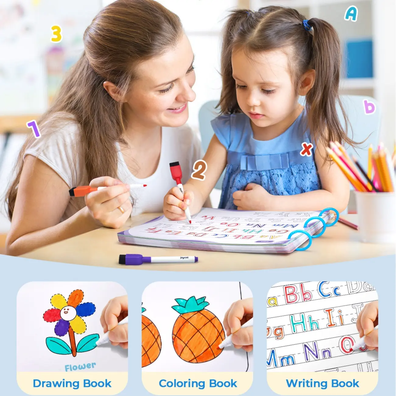 Reusable Handwriting Practice Books are made of cardboard, waterproof and tear-resistant, made of the highest quality safe material, The smooth surface is perfect for writing, with a large wiping cloth can be easily wiped clean without affecting them multiple times of use; Upgraded high-capacity 8 markers can be used to write for longer periods, perfect for learning.