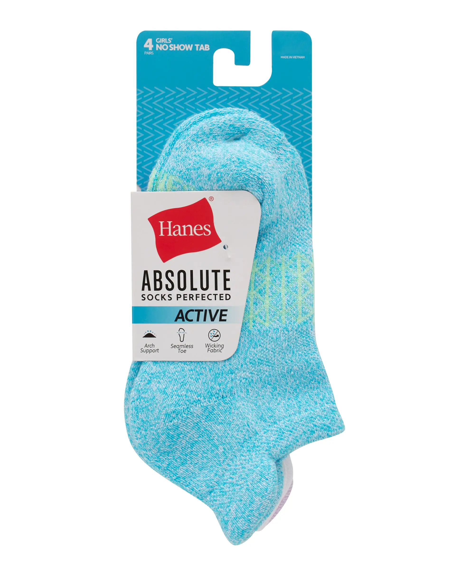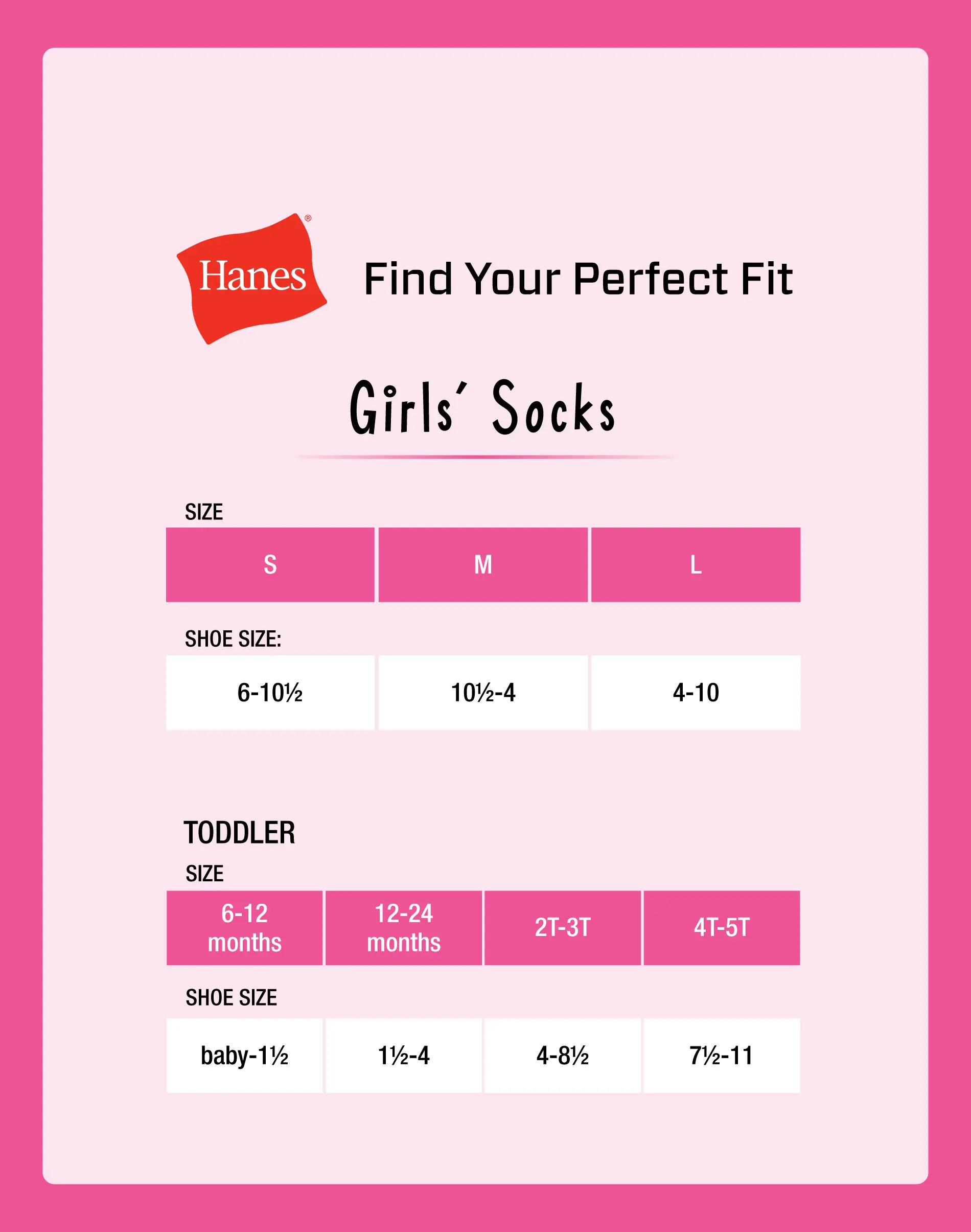 SOCKS PERFECTED Built from our very best fabric, Hanes Absolute™ Active Girls' Heel Shield Socks surround her feet with softness - thanks to a cozy cotton blend and an extreme cushion footbed that is soft and thick and amazingly comfortable. Arch support delivers an improved fit, while the smooth, seamless toe helps reduce irritation. Wicking fabric keeps her cool and comfy, no matter how active her day is. She’ll love the cute designs in versatile socks she'll want to show off. The best part? This four-pack of exceptional socks offers unbeatable quality at an impressive price point. Hanes Absolute. Because her comfort shouldn’t compromise your budget. SOCKS PERFECTED, HANES GUARANTEED - Stock up with four pairs of girls' socks for unbeatable quality at an impressive price point.