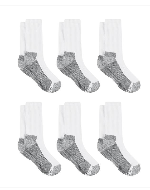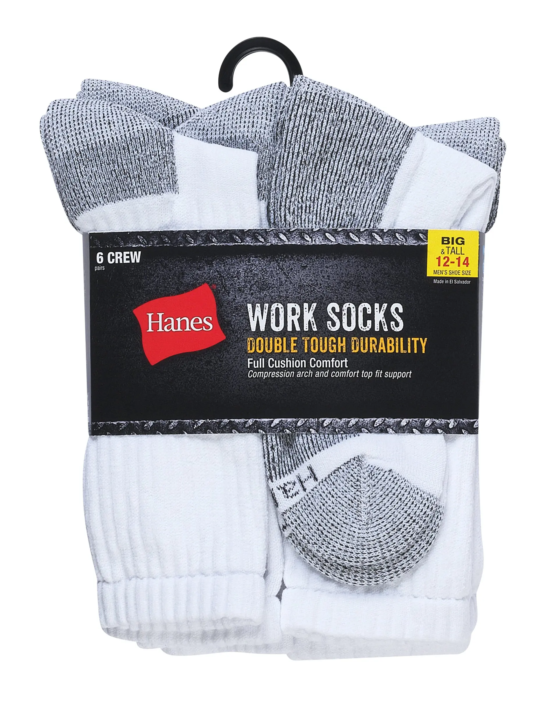 WORK HARD, PLAY HARD These Hanes men's big and tall crew socks work as hard as you do. These soft but strong crew socks are made to last with a reinforced construction that cradles your foot with an extra-cushioned bottom that softens the impact with every step. They are crafted with high-tech features, including Cool Comfort® fabric that wicks away moisture to keep feet cool and dry, and odor-fighting technology that attacks odor-causing bacteria to keep feet smelling fresh. These tough work socks have built-in arch compression around the foot for a supportive fit, plus ventilated inset panels that help your feet breathe and smooth toe seams that enhance comfort even more. Stock up on these hard-working, made-to-last crew socks in a convenient 6-pack and fill your sock drawer with enduring comfort. DOUBLE TOUGH, WE MEAN IT - Reinforced construction has been shown to last twice as long during testing.