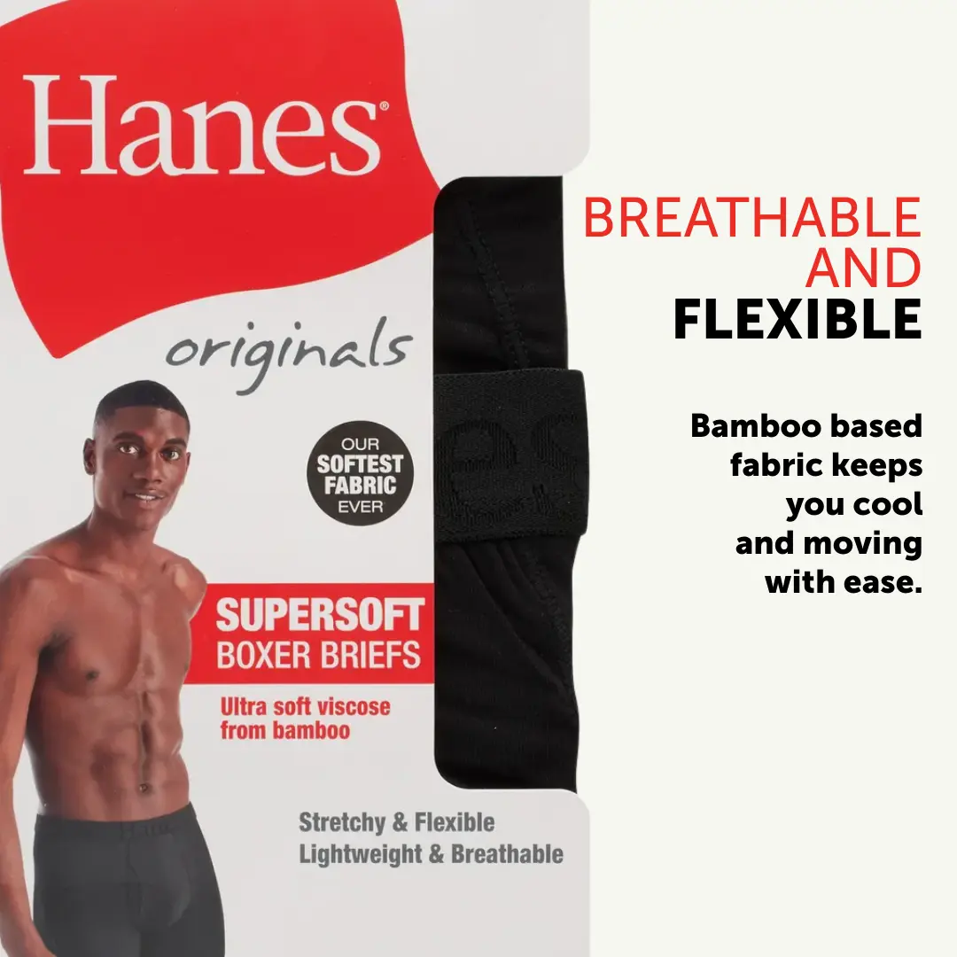 IT'S SOFT, IT'S COOLING, IT'S EVERYTHING Indescribably soft. Cool and breathable. These Hanes Originals men’s boxer briefs are made from our softest fabric EVER - luxurious viscose from bamboo fabric that is both super lightweight and engineered to beat the heat. Comfort is built into an elevated, modern design that features a lower rise, a plush and stretchable waistband, and sophisticated colors that keep it classic. Soft seams help reduce chafing, and you’ll love the no-ride-up fit in moisture-wicking underwear that feels as cool as it looks. Hanes Originals. Who says you can’t have style and comfort? (Not us).
