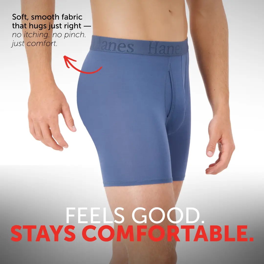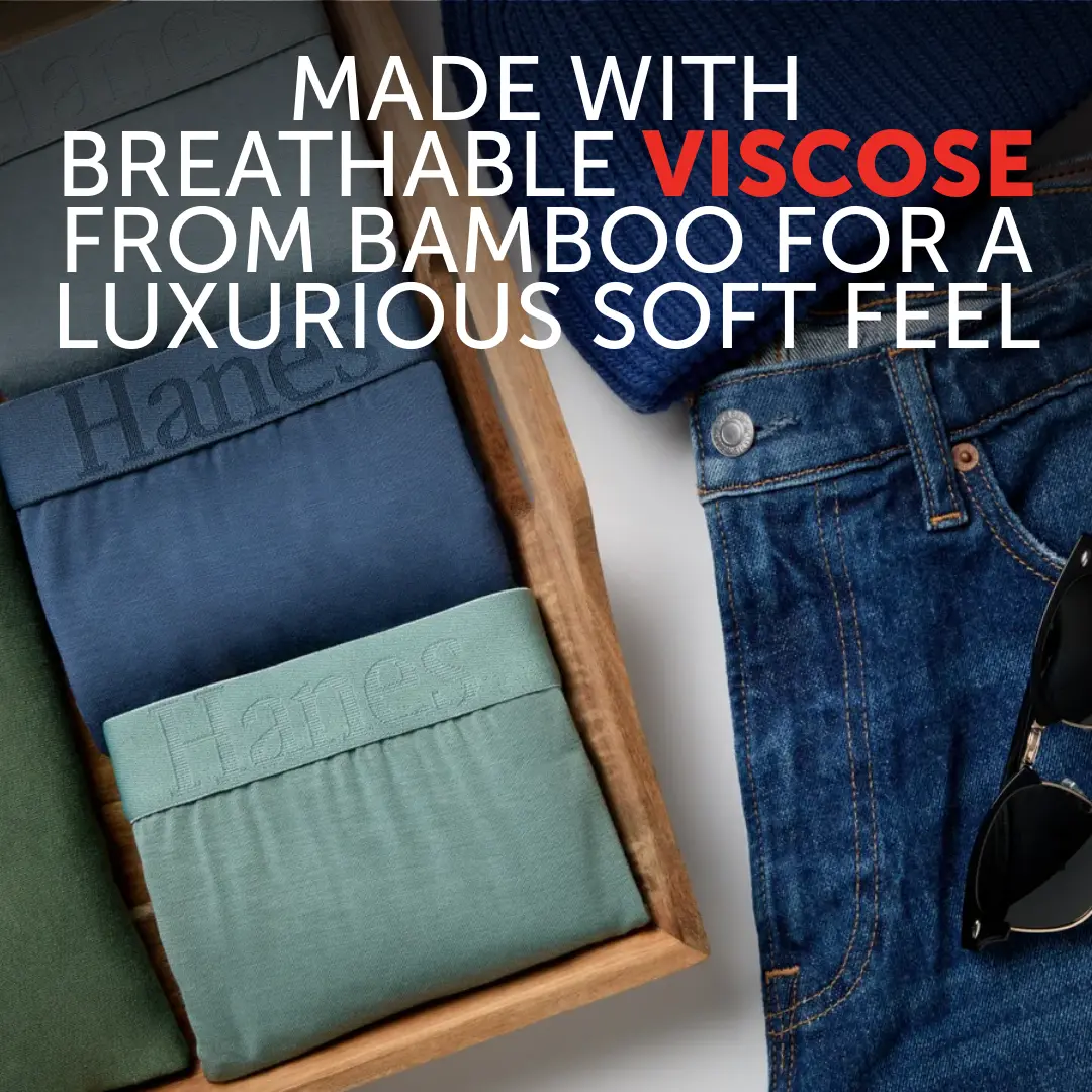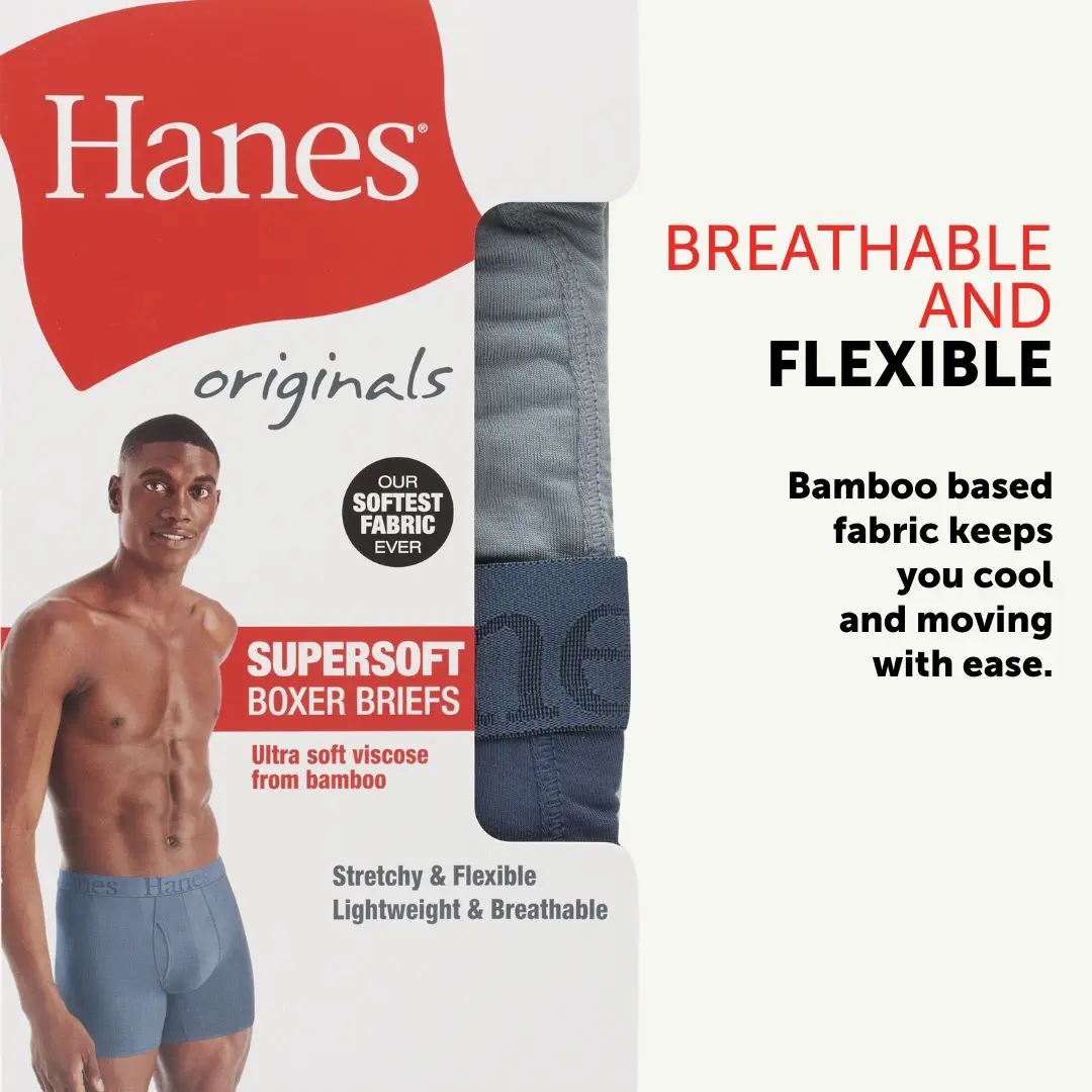 IT'S SOFT, IT'S COOLING, IT'S EVERYTHING Indescribably soft. Cool and breathable. These Hanes Originals men’s boxer briefs are made from our softest fabric EVER - luxurious viscose from bamboo fabric that is both super lightweight and engineered to beat the heat. Comfort is built into an elevated, modern design that features a lower rise, a plush and stretchable waistband, and sophisticated colors that keep it classic. Soft seams help reduce chafing, and you’ll love the no-ride-up fit in moisture-wicking underwear that feels as cool as it looks. Hanes Originals. Who says you can’t have style and comfort? (Not us).