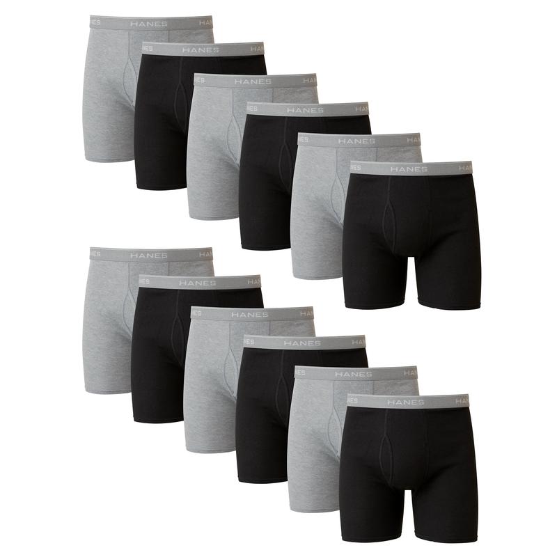A VALUE YOU'LL LOVE Why risk ever running out of clean underwear? This men's underwear set comes in a value pack of 12 black boxer briefs, so you can always keep a fresh pair on hand. These men's boxer briefs are made from lightweight cotton and feature Cool Comfort® fabric, our moisture-wicking fabric that keeps you comfortable all day long. Enjoy move-with-you comfort thanks to the Comfort Flex® waistband. Hanes's no-ride-up design and roomy fit make this men's underwear ideal for everyday wear. VALUE PACK - This men’s boxer briefs pack includes 12 black pairs with contrasting waistbands. MOISTURE-WICKING UNDERWEAR - Cool Comfort technology helps wick moisture to keep you cool and comfortable all day long. COMFORT AT THE WAIST - Comfort Flex waistband moves with you. NO RIDE-UP - Our no-ride-up fit is designed to stay in place. TAGLESS® - Because who has time for scratchy tags? COLD WASH - Hanes recommends machine washing these men's boxer briefs in cold water to reduce energy usage.
