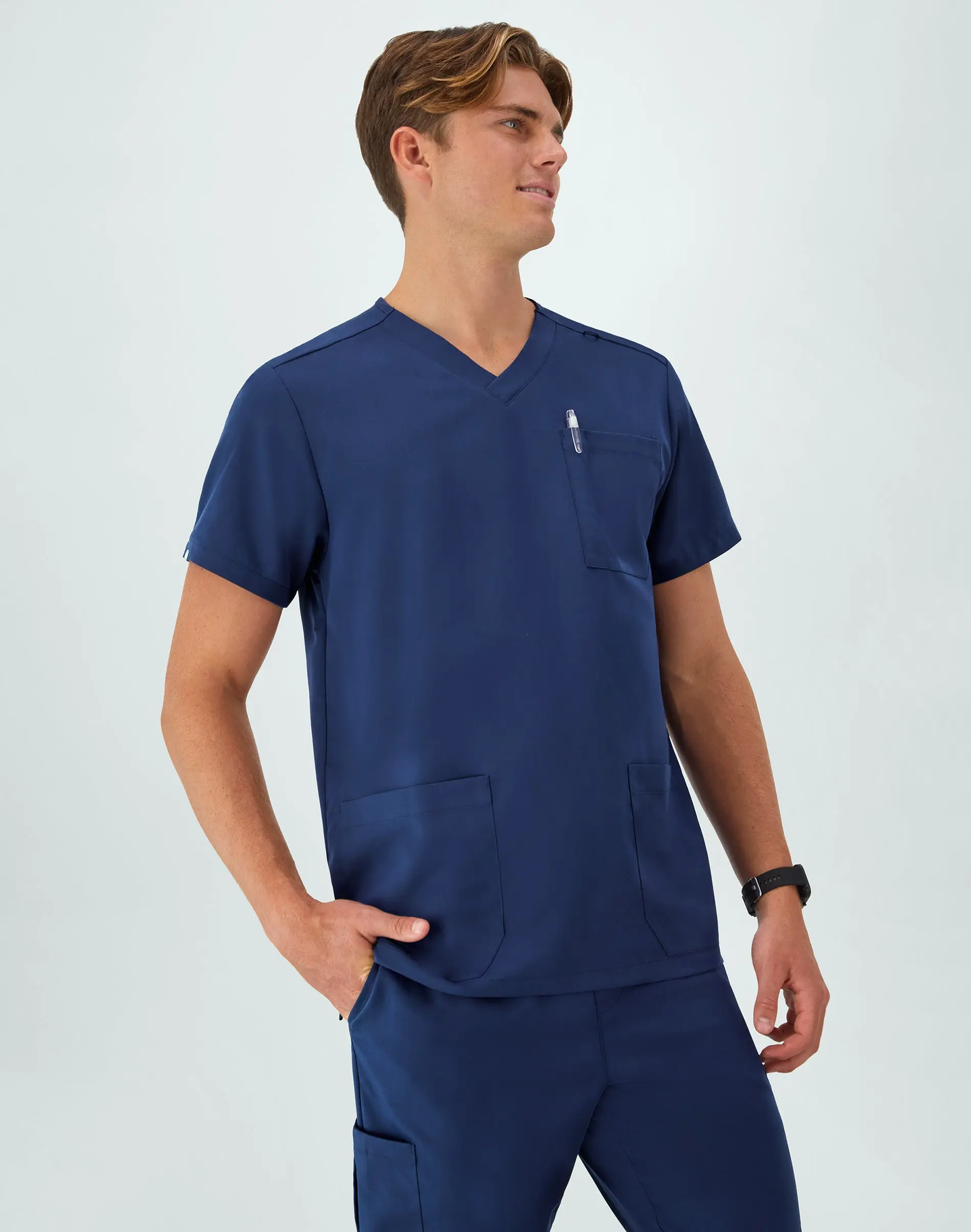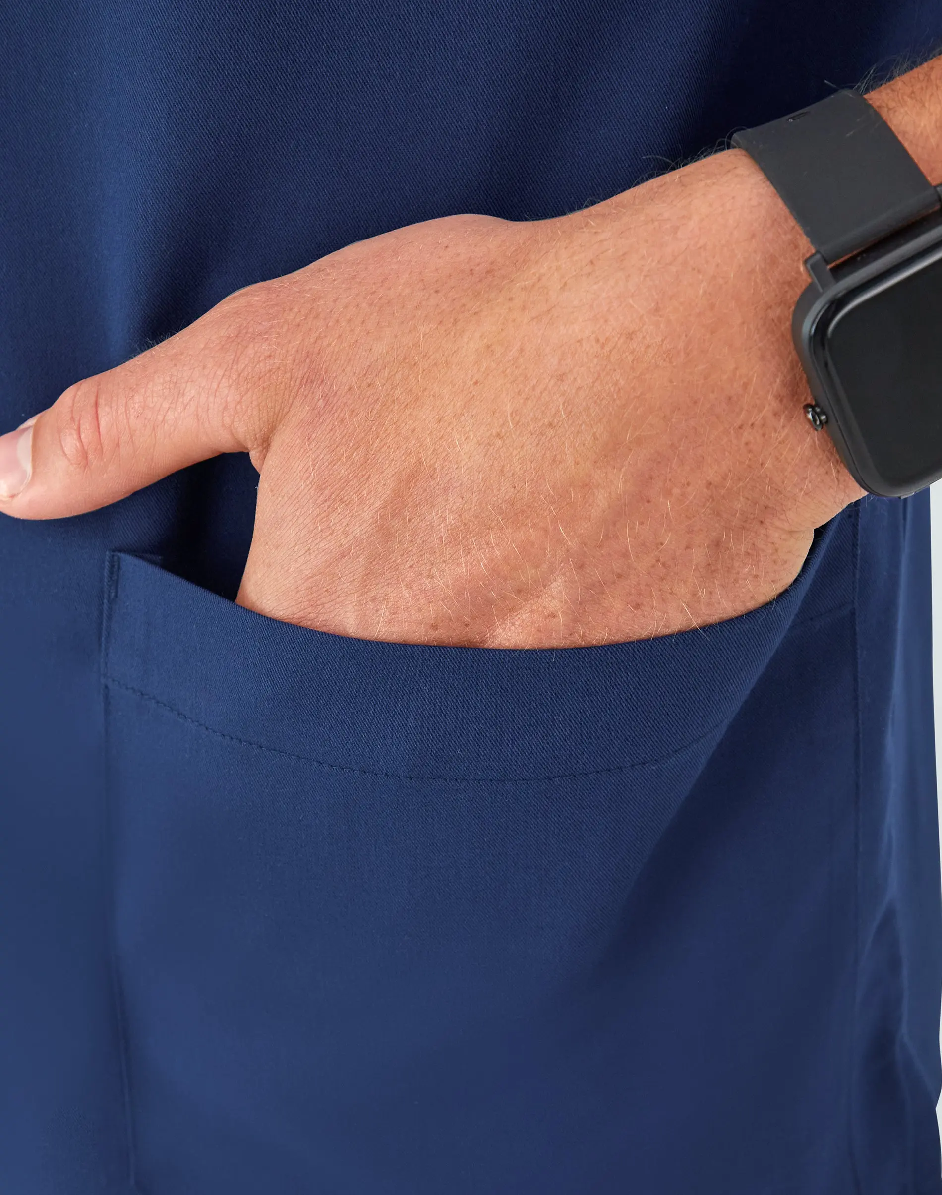 THE DETAILS - This far-from-basic men's scrub shirt features a chest pocket and two large front patch pockets, side hem vents, V-neck collar, and a convenient badge holder.