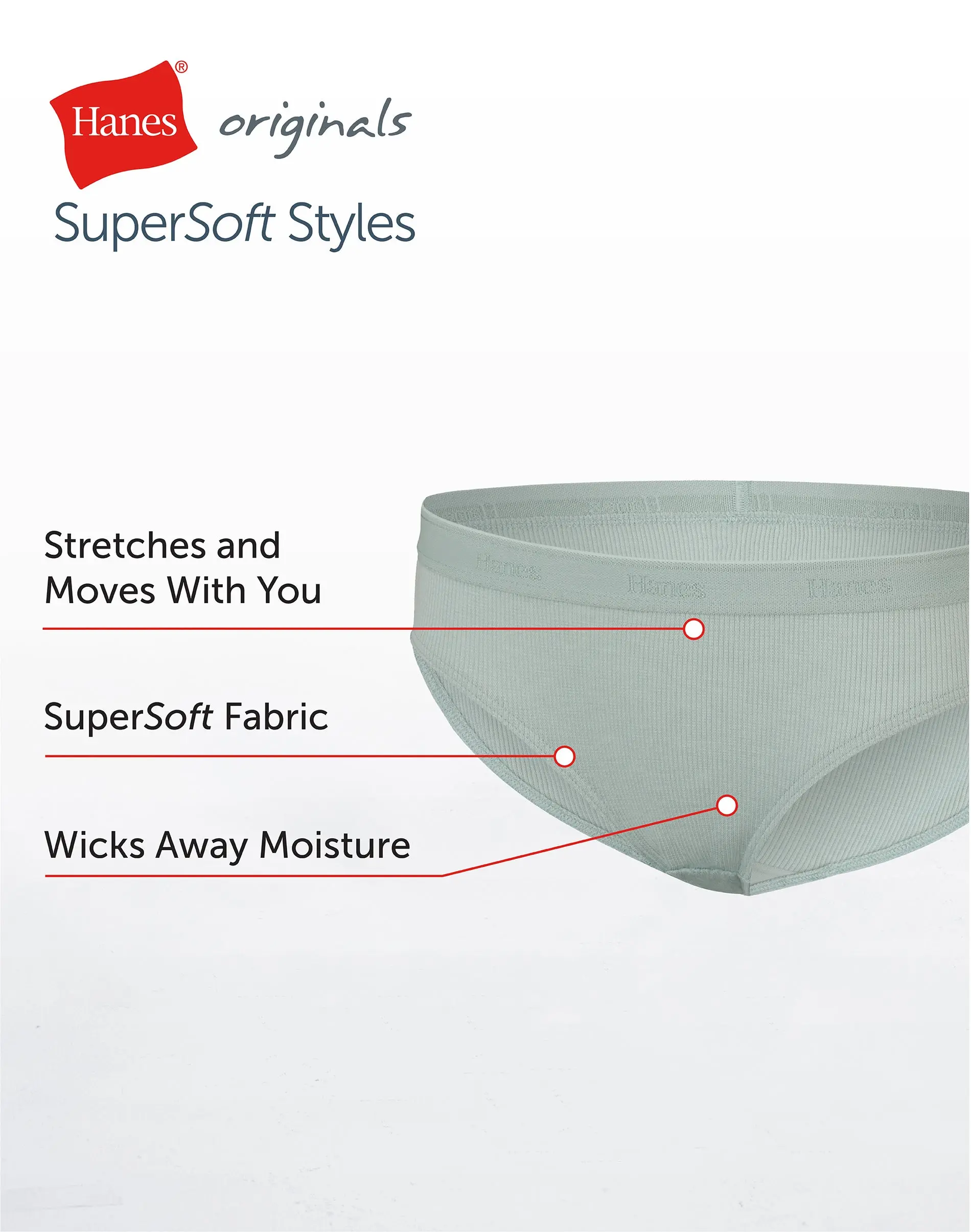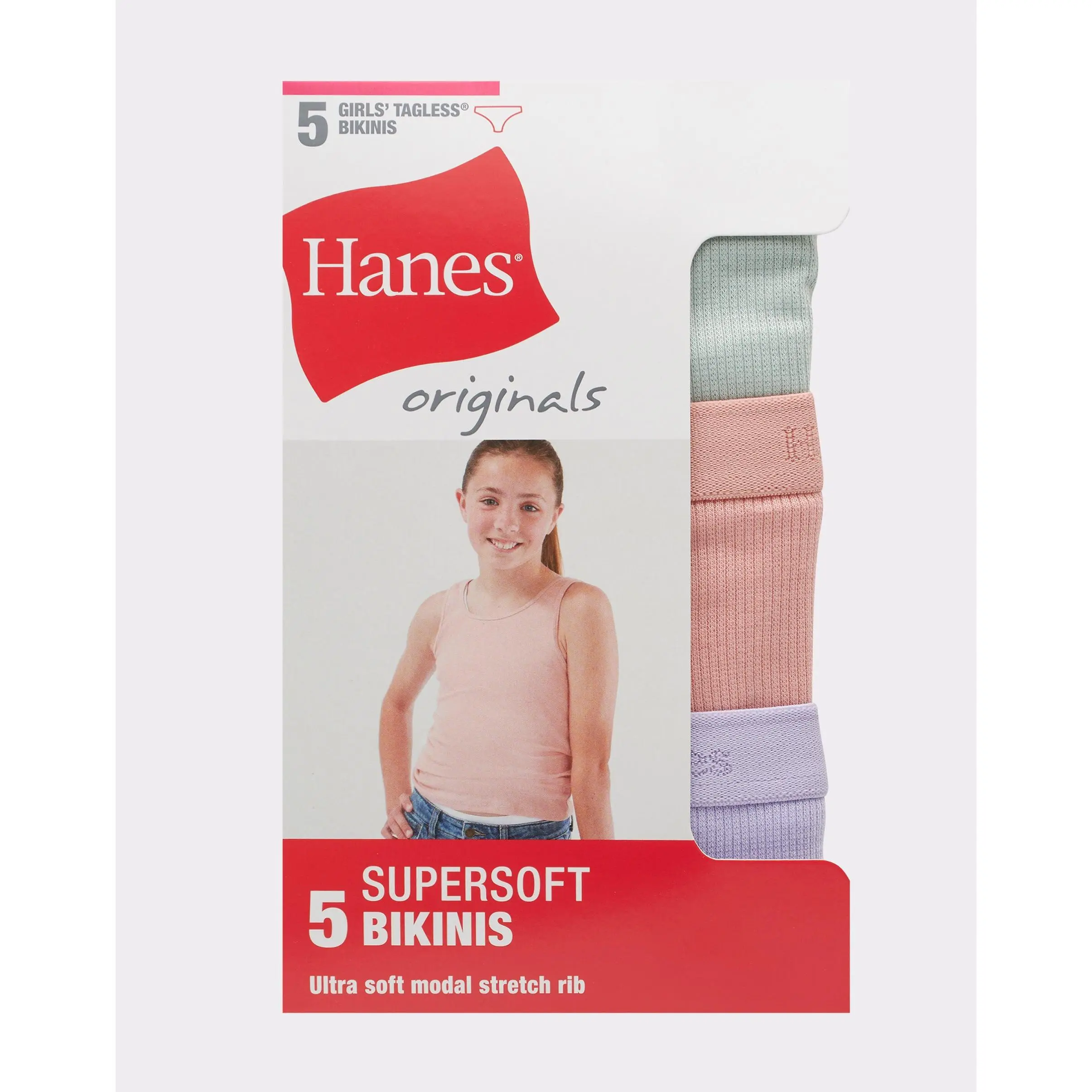 NOT JUST SOFT , SUPER SOFT You'll appreciate the exceptional quality, but she's going to love the incredible softness of this Hanes Originals Girls’ Super Soft Bikini underwear. Crafted from soft modal stretch rib fabric, these bikini panties allow her to feel her best. A Comfort Flex® waistband adjusts to her unique shape while the moisture-wicking fabric keeps her comfortable. This girls' bikini is finished with a tag-free interior, so there are no scratchy tags to irritate her. Stock up with an assorted color 5-pack with matching waistbands. Hanes Originals. Soft Just Got an Upgrade.