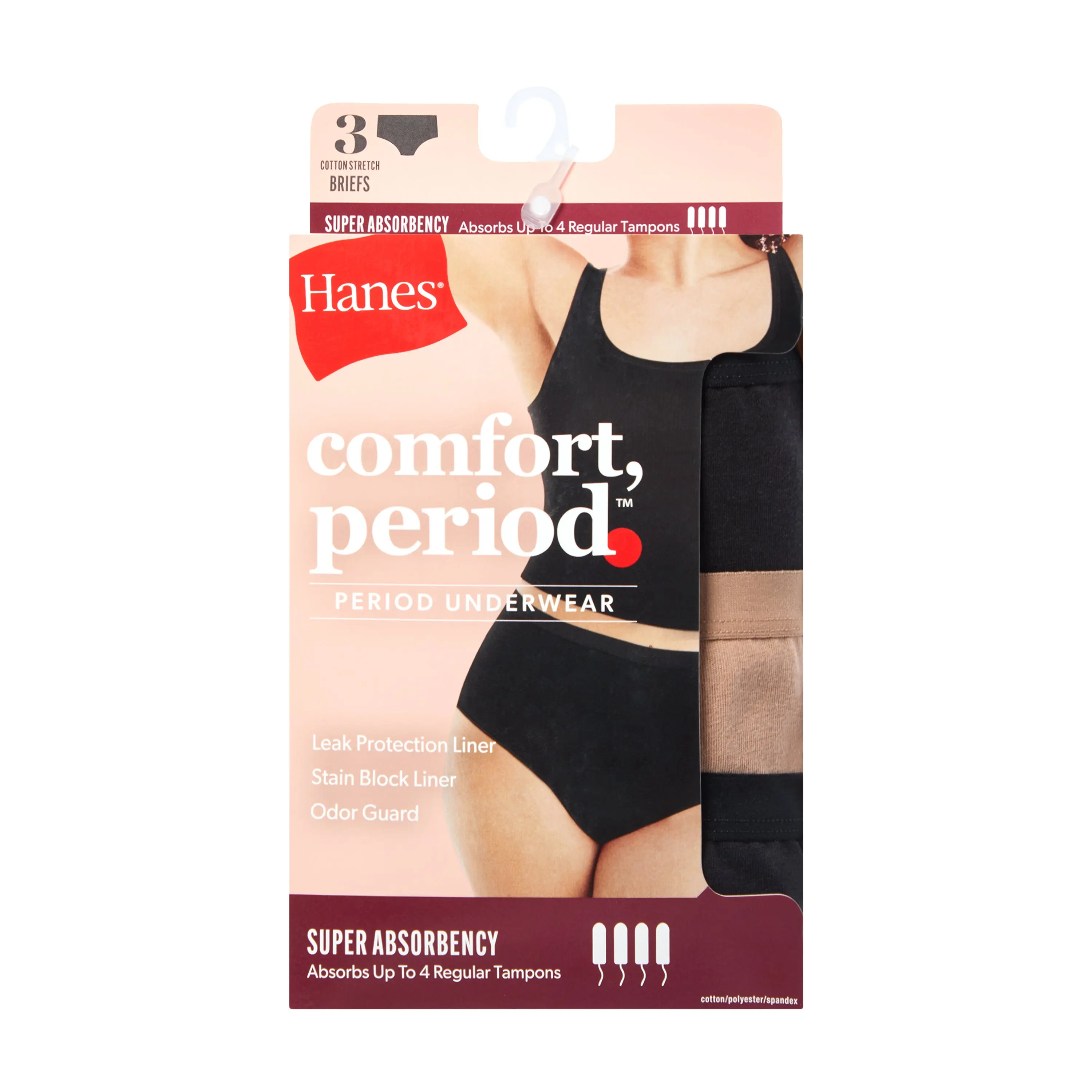 GO ANYWHERE, DO ANYTHING PROTECTION With Hanes Comfort, Period.™ protection, you can go anywhere and do anything without worrying about leaks, odor, or bulk. The absorptive stain block liner in these brief period panties helps reduce staining, while the streamlined design reduces bulk under your clothes. The super leaks protection offered in this period underwear is designed to provide peace of mind for periods, postpartum bleeding, unexpected leakage during exercise, or overnight accidents. Well-suited for extended wear, the moisture-wicking technology keeps you cooler and more comfortable while the odor guard helps to neutralize unwanted odors. Know what’s even better? This women's underwear is washable and reusable so it’s easier on your wallet. *Hanes is the #1 brand of women's period panties. Source: Circana, Retail Tracking Service, U.S. brand unit sales, 12 months ending December 2024. GET REIMBURSED, FSA/HSA/HRA ELIGIBLE - Period underwear is covered by Flexible Spending Arrangement (FSA), Health Savings Account (HSA), or Health Reimbursement Arrangement (HRA) accounts.