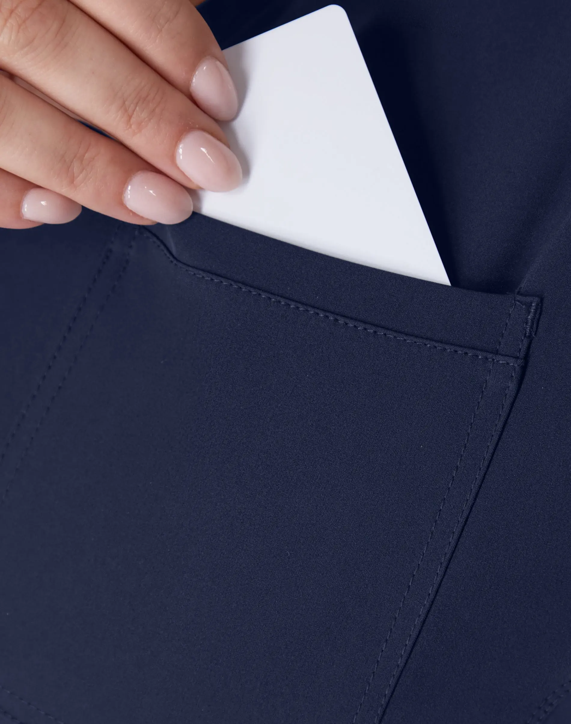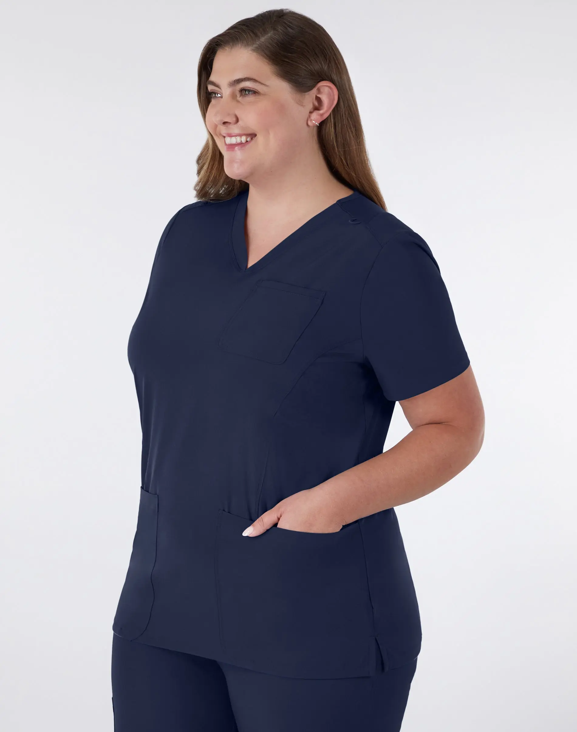 THE DETAILS - This far-from-basic scrub top features two deep hand pockets, a chest pocket, a built-in badge holder at the neck, V-neckline, and a tag-free interior.
