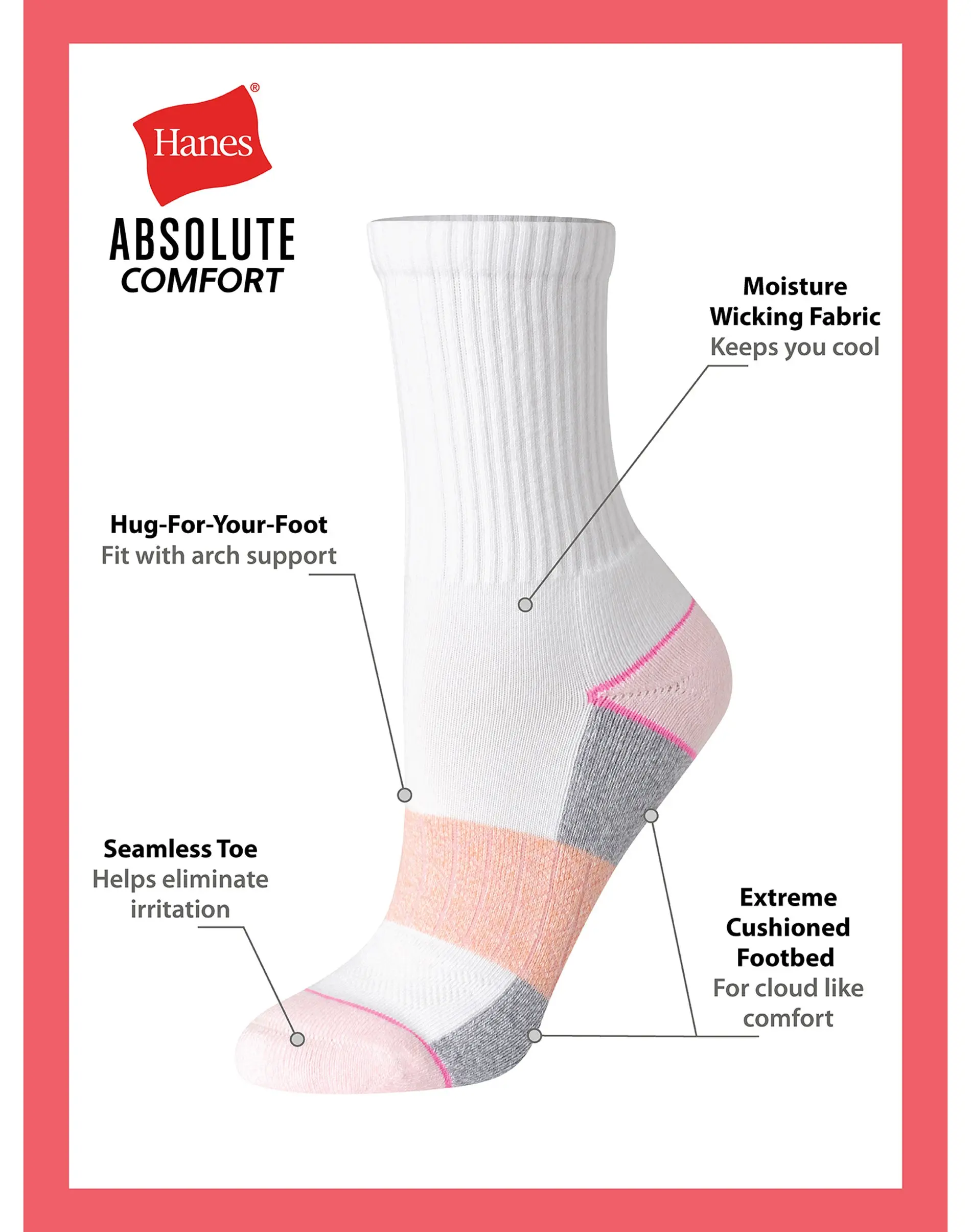 ABSOLUTELY COMFORTABLE SOCKS Soft and thick and outrageously comfortable, Hanes Absolute™ Comfort women’s crew socks are built from our very best fabric. Crafted from a thick cotton blend, these exceptional women’s socks surround your feet with softness and feature a seamless toe designed to reduce friction and irritation. Ribbed arch support, extreme cushion footbed, and Y-heel pocket offer exceptional stability and a snug fit. Wicking fabric keeps you feeling cool. Hitting at the mid-calf, these women’s crew socks are the perfect match for sneakers, boots and more. The best part? This four-pack of women’s socks offers unbeatable quality at an impressive price point. Hanes Absolute. Because your comfort shouldn’t compromise your budget.