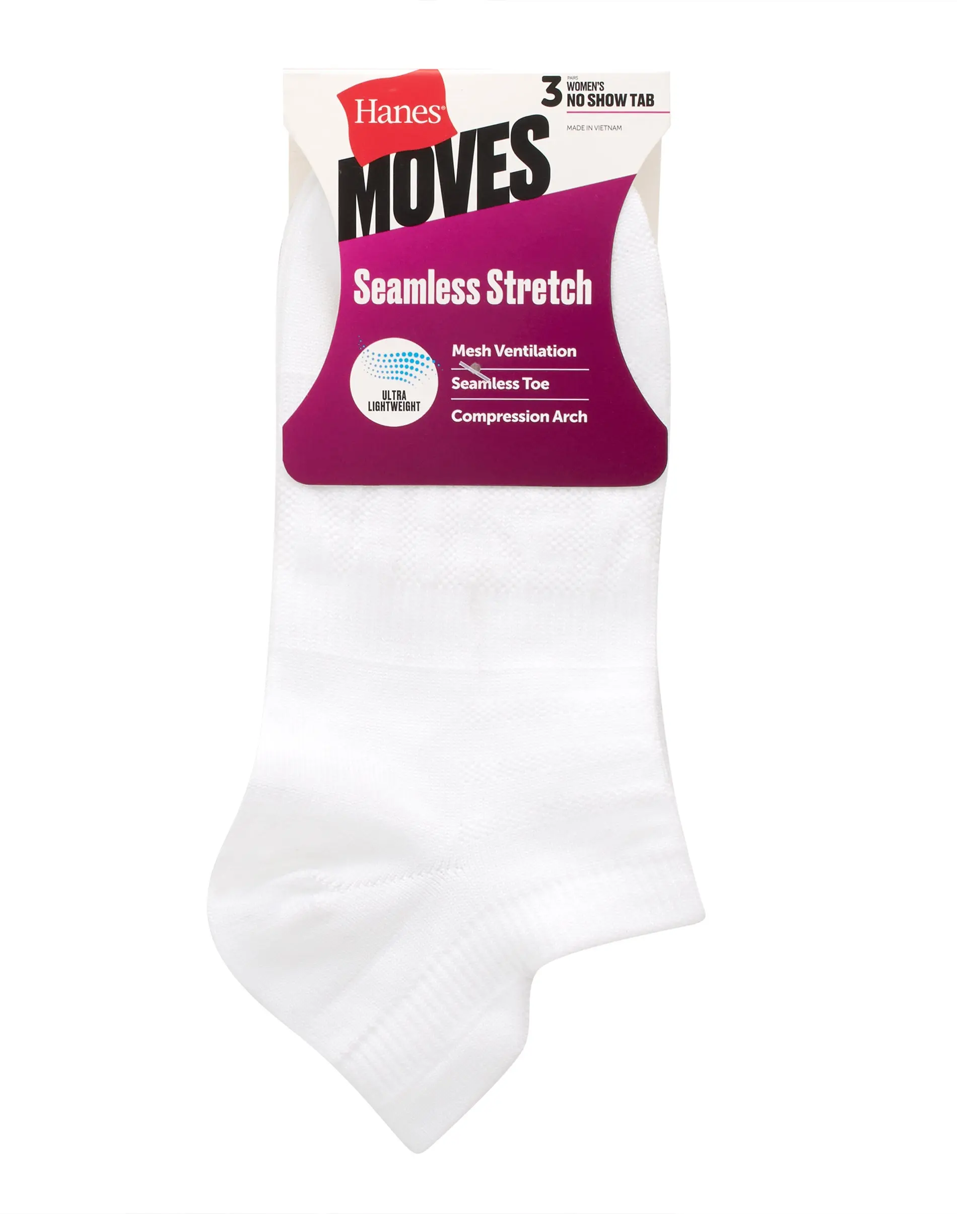 READY FOR ANYTHING Give your feet the comfort they deserve, (and your wallet a break too) with Hanes Moves™ Women's Seamless Stretch No Show Tab Socks. Designed to move with you effortlessly, these lightweight no show socks offer a smooth, barely-there fit that keeps you focused on your day, not your feet. With a heel-hugging design and a tab at the back of the heel, you won't have to worry about any annoying slipping or sliding. The seamless toe adds an extra touch of comfort, while the compression arch provides just the right amount of support. Plus, the moisture-wicking fabric with mesh ventilation and odor guard keep you feeling fresh and cool all day long. And with a sleek look that’s too good to hide, these women’s no show socks are as stylish as they are comfortable - so you won’t mind showing them off. Hanes Moves. Ready for Anything.