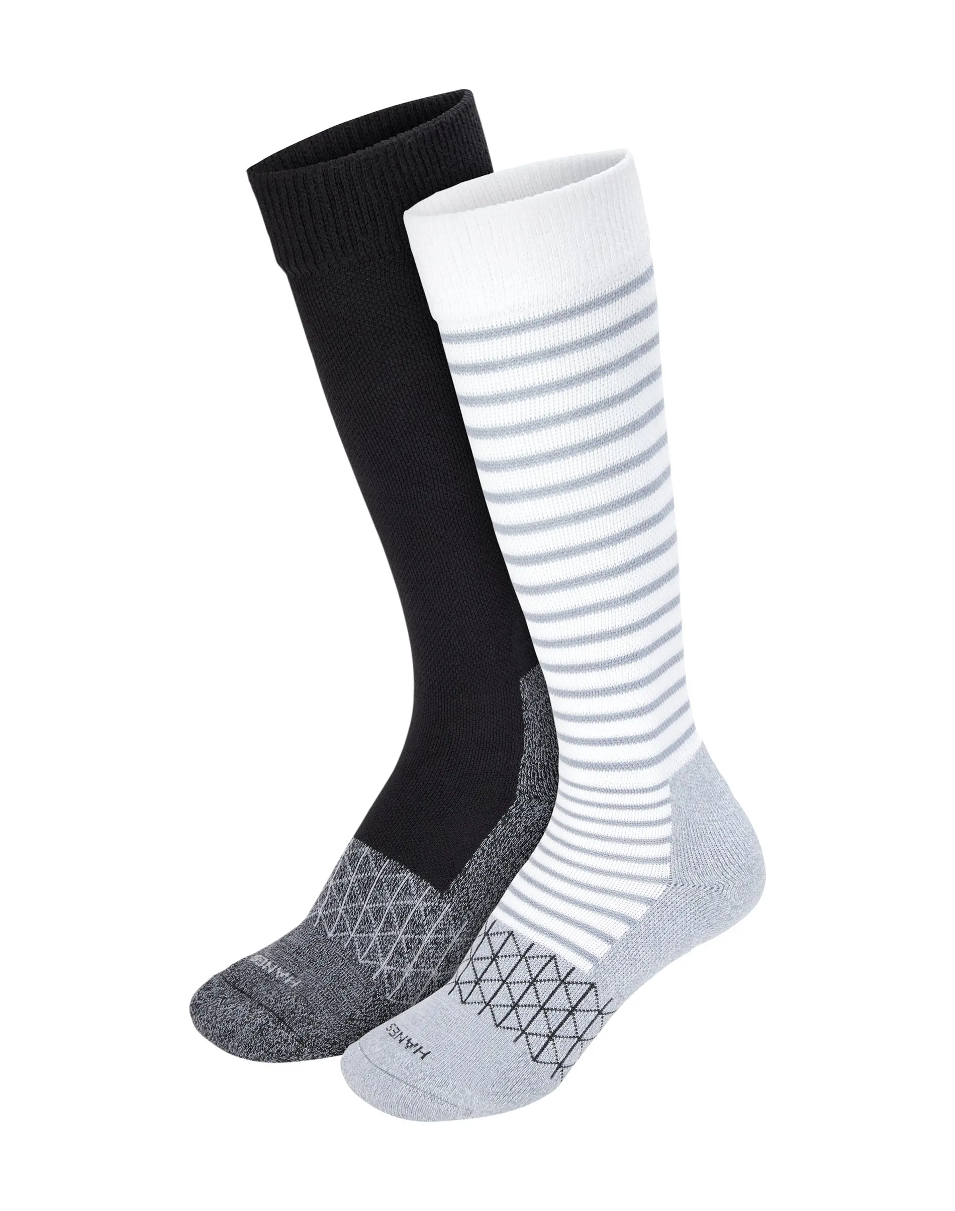SOCKS PERFECTED Soft and cushioned and offering mild graduated compression, Hanes Absolute™ Wellness women’s over-the-calf socks are built from our very best fabric. Crafted from a cozy cotton blend with an extreme cushion footbed, these exceptional women’s socks surround your feet with softness. The top of the sock extends above the calf and is stretchy but non-binding - providing the supportive fit you need while remaining non-restrictive. The mild graduated compression supports the leg, while arch support in the foot delivers an improved fit. The best part? This two-pack of women's socks offers unbeatable quality at an impressive price point. Hanes Absolute. Because your comfort shouldn't compromise your budget.