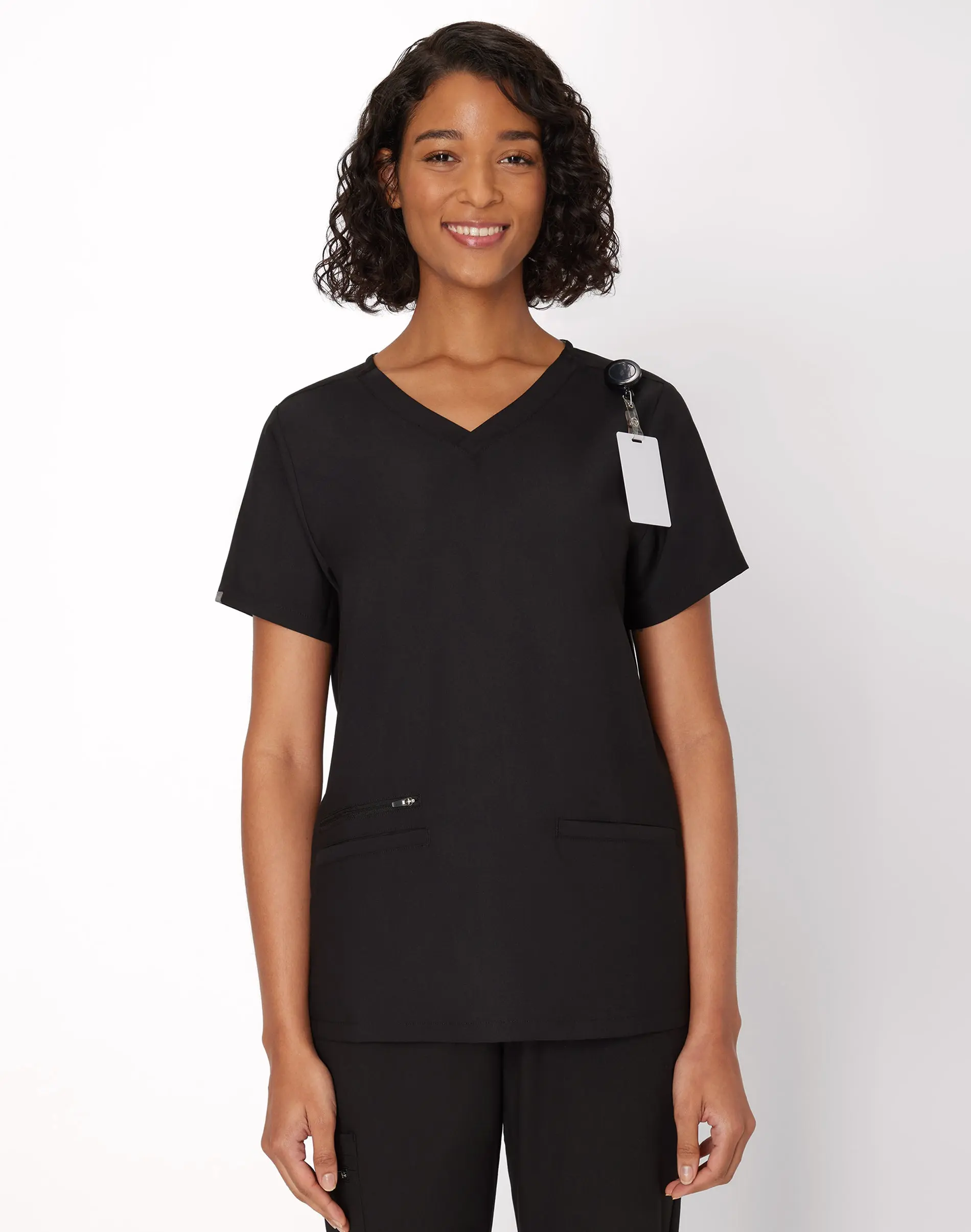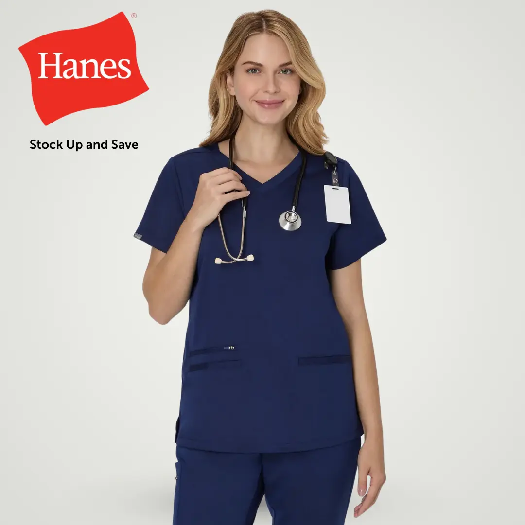 SCRUB IN WITH STYLE Hanes Premium Scrubs offer an elevated blend of innovative comfort, functionality, and style. This comfy scrub top has a curved hem with side vents, three easy-access pockets, and a sturdy design that’s built to last. Crafted from a made-to-move fabric that delivers high-performing mobility and comfort, this scrub top pairs perfectly with our matching women’s scrub pants or joggers. Hanes Premium Scrubs. You work hard so you deserve the best. SCRUBS THAT DON’T FEEL LIKE SCRUBS - Made from a soft Triblend fabric (polyester/rayon/spandex) that delivers a comfy feel against your skin, ensuring smooth, easy movement. PLENTY OF POCKETS - Features three total pockets including two slant double welt pockets and one zipper pocket.  ALL IN THE DETAILS - Classic V-neck style with back neck tape featuring a curved hem with side vents and a convenient badge holder. MADE TO MOVE - Elevated fabrics, forward seams, and an athletic fit deliver high-performing mobility.  FIND YOUR SIZE - Available in a wide range of sizes, including plus-size scrubs up to 3XL. MOISTURE WICKING - Cool Comfort® fabric wicks moisture from the skin, so you'll stay cool and comfortable all day. ODOR CONTROL - Antimicrobial technology for odor control attacks odor-causing bacteria, so you'll feel fresher. BUILT TO LAST - Sturdy stretch fabric is designed for lasting wash and wear needs. TAGLESS® - Because who has time for scratchy tags? COLD WASH - Hanes recommends machine washing women's scrubs in cold water to reduce energy usage.