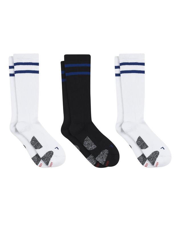 STARTS COOL, STAYS COOL COMPRESSION SOCKS Hanes men’s compression crew socks bring the comfort, no matter where the day takes you. Designed with X-Temp™ technology, these compression socks adapt to your body temperature and activity, keeping your feet extra cool and dry. The innovative design combined with moisture-wicking Cool Comfort® fabric makes these men’s socks ideal for the gym, outdoor sports and beyond. Made with graduated leg and arch compression for all day performance and a supportive fit, these men’s socks are sure to up your game. High impact cushioning targets comfort zones and helps with shock absorption, ideal for the guy on the move. Finished with sporty striped detailing, these men’s compression crew socks are available in a convenient 3-pack for stock-up ease. When it comes to Hanes men’s socks and other brands, there’s really no competition. We’re built for this.