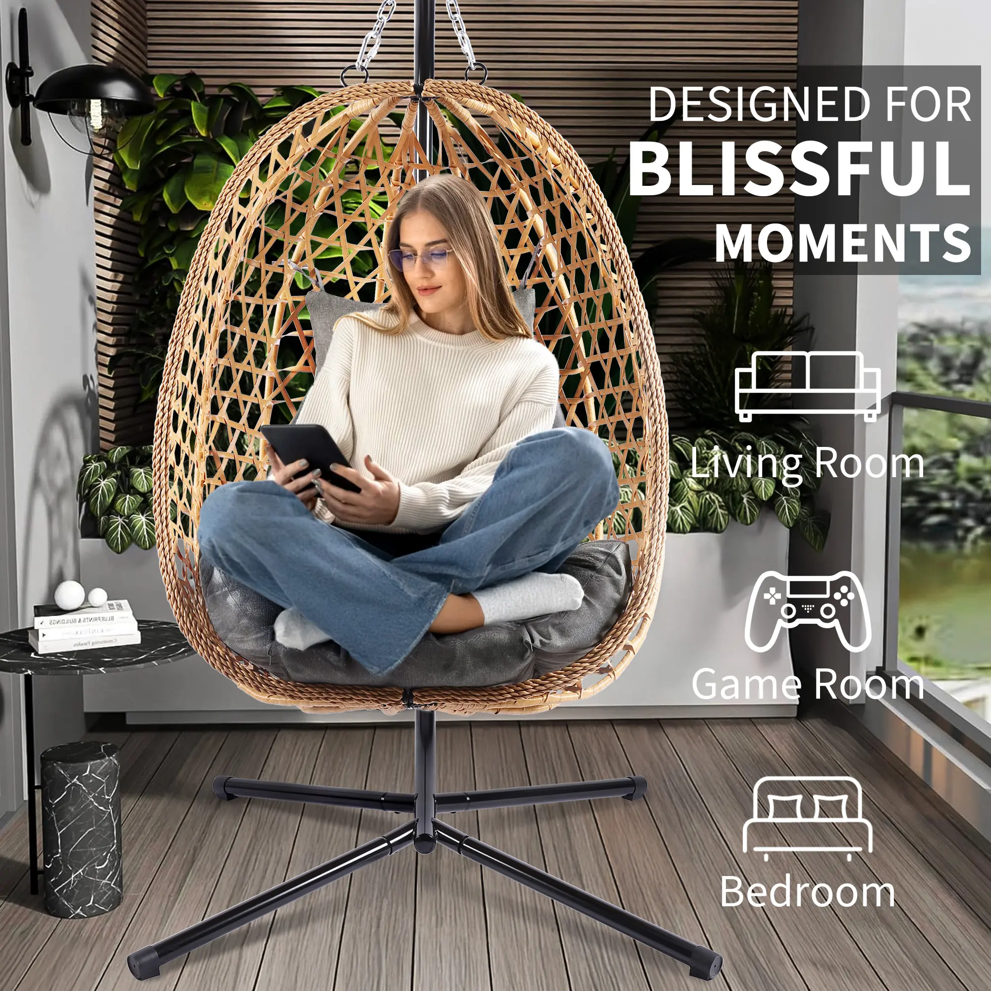 ·Exceptional Comfort & Ergonomic Design Sink into relaxation with our boho-inspired egg swing chair, designed for ultimate comfort. The ergonomic shape cradles your body naturally, while the plush, thickened cushion provides superior support for hours of lounging without fatigue. Whether reading, napping, or simply unwinding, this chair offers a serene escape.