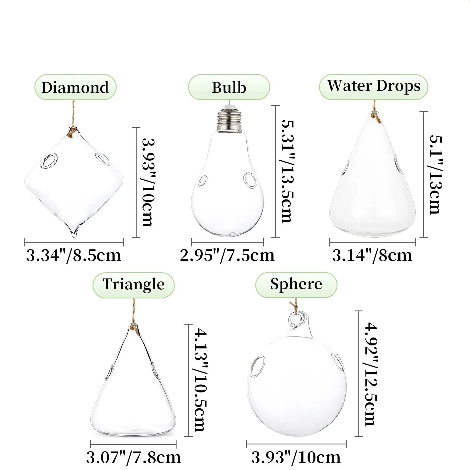 Product arrived in perfect shape. Love all the different shapes and sizes. Cannot wait to hang and get cuttings going. Thinking I might turn the largest into a hanging terrarium