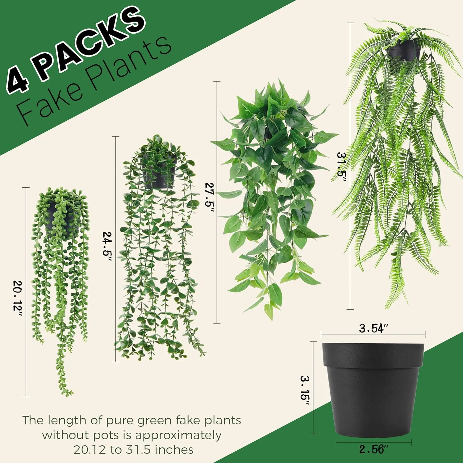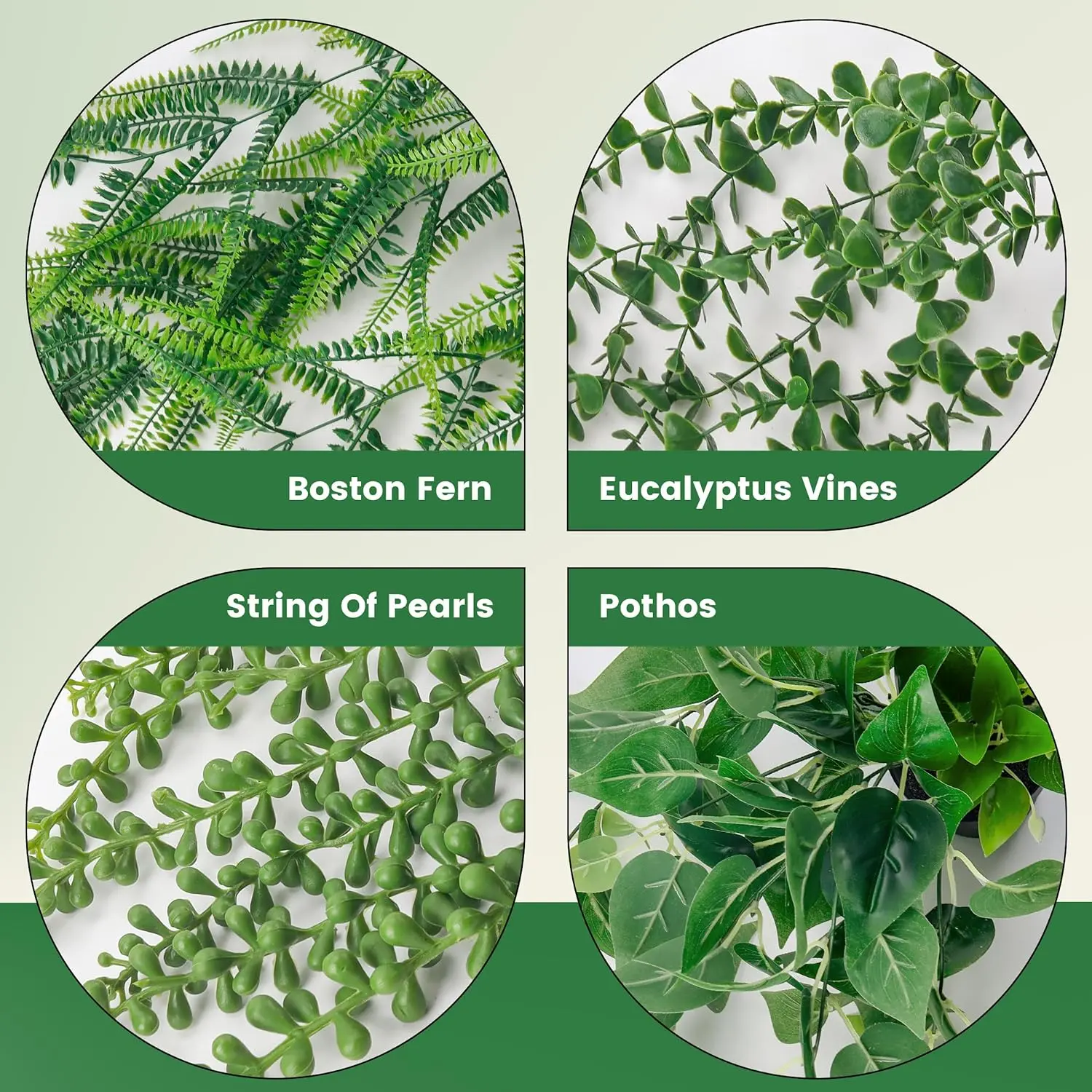 ·【Perfectly Sized】With 4 different styles of fake hanging plants with white pots. 24.5" for eucalyptus leaves, 20.12'' for string of pearls, 31.5'' for boston fern and 27.5''for fake pothos