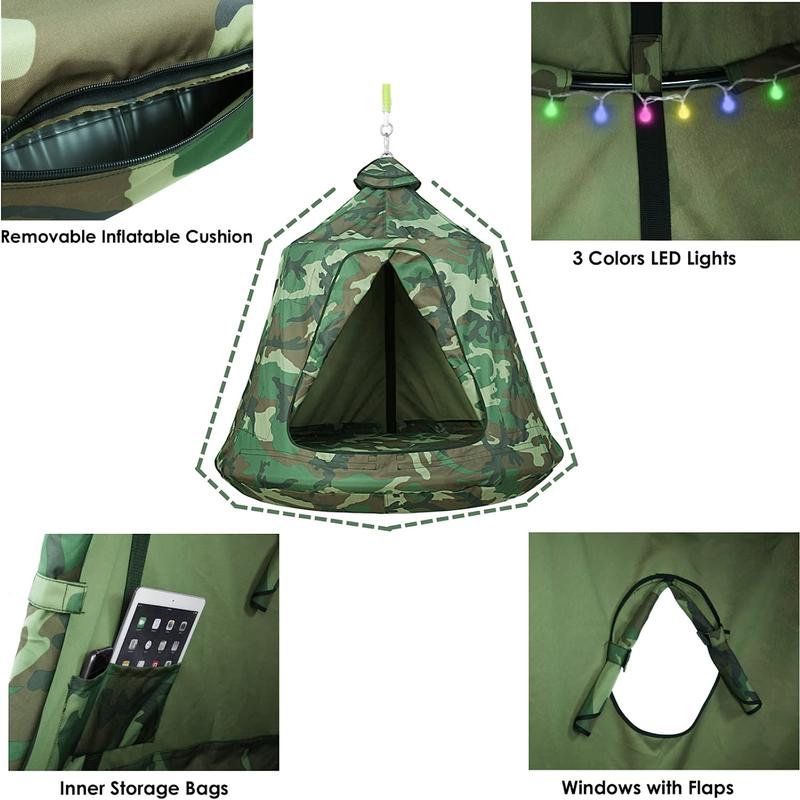 ·LED LIGHT STRIP DECORATION: Tree tent with stand comes with 118 inches (long) LED rainbow decorative light strip. The colored lights bring you a mysterious atmosphere. Note: 3 AA batteries are NOT included. There is an inflatable cushion on the bottom that is soft and comfortable. You can quickly inflate it with the included air pump.