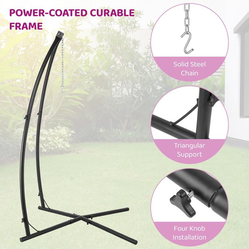 ·X BASE DESIGN: Stand Base features a cross design. X-shaped base has a larger contact area with the ground, which helps to distribute the gravity of the hammock. Each leg has a fixing hole so you can use ground pegs to securely fasten it to the ground. Note: Product does NOT include ground stakes.