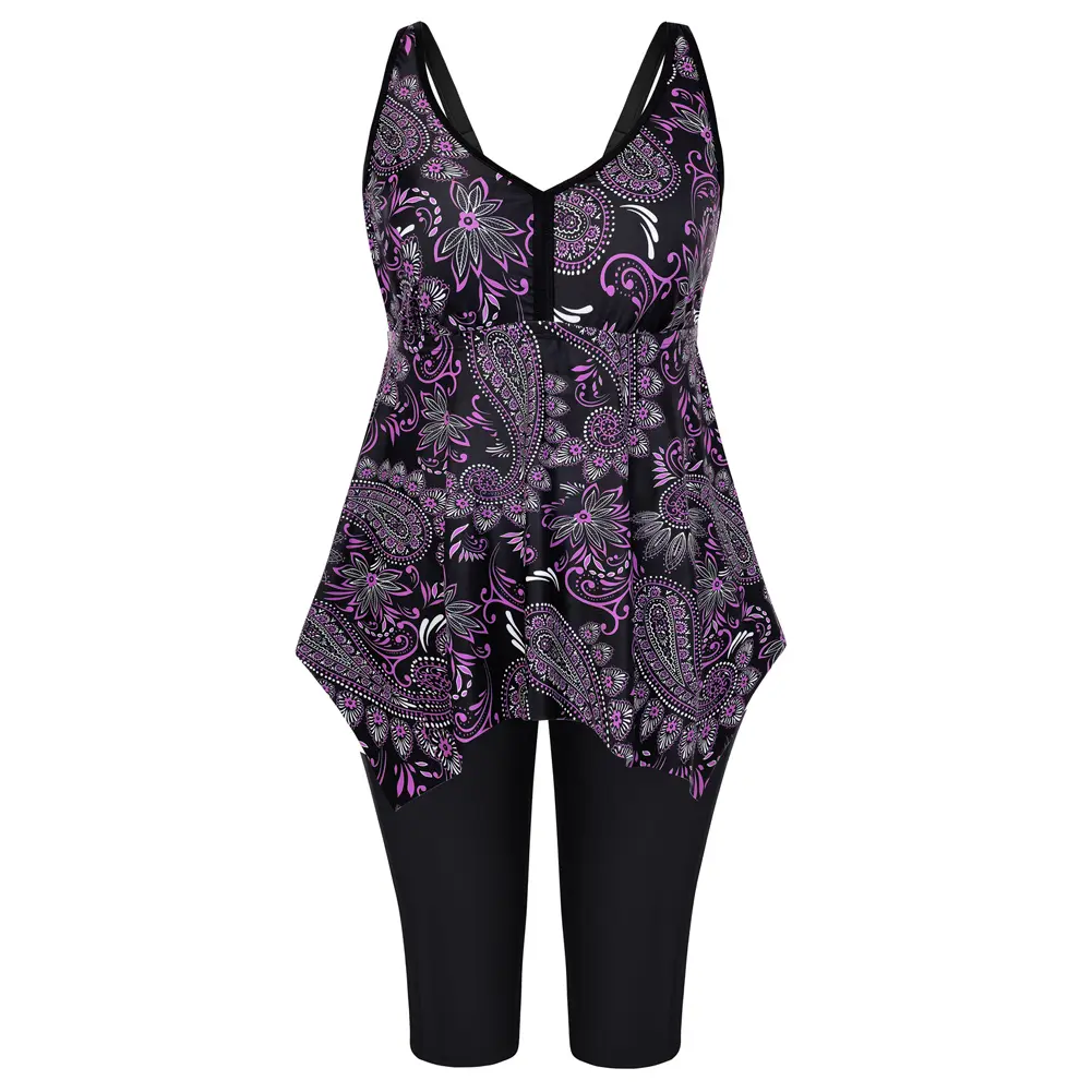Plus Size Modest Two Piece Tankini Sets Flowy Swim Tank Top with Capris Shorts