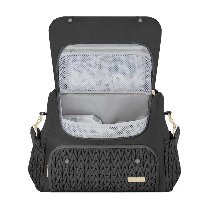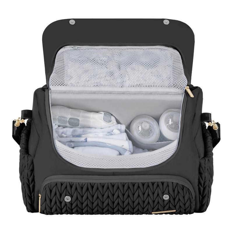 ·Measures 16"W x 7.5"B x 12.5"H with a 3" handle drop and a 24" strap drop; weighs 2.6 lbs, holds up to 6.6 lbs; Changing pad 28.38"L x 14"W