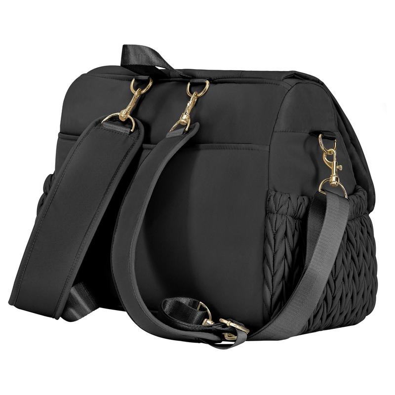 ·Snap closure, detachable straps, multicolor hardware, four side and front slip pockets, three zip pockets, changing pad