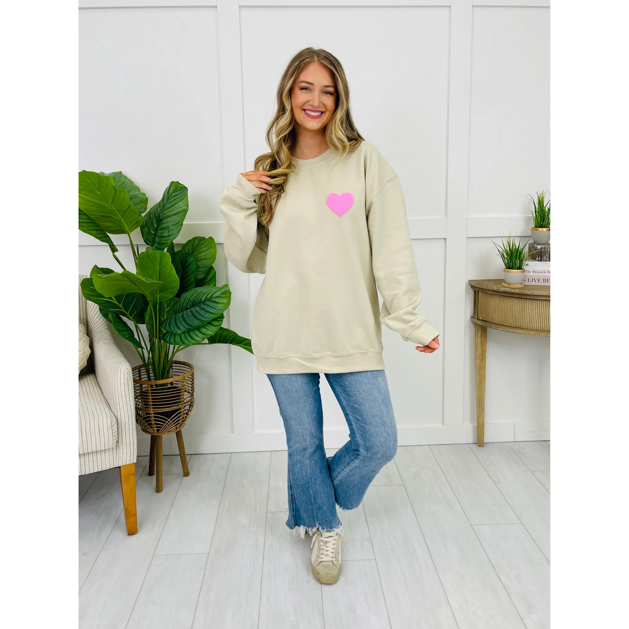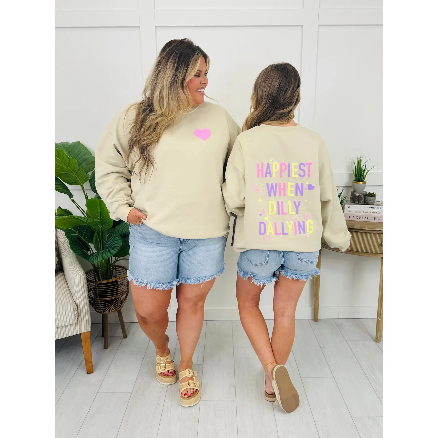 Bring a little joy to your everyday look with the Happiest When Dilly Dallying sweatshirt — a lighthearted, feel-good design made for slow days and happy moments. The sweet front heart detail pairs perfectly with the colorful, playful back graphic, creating a fun surprise that feels cheerful and carefree.