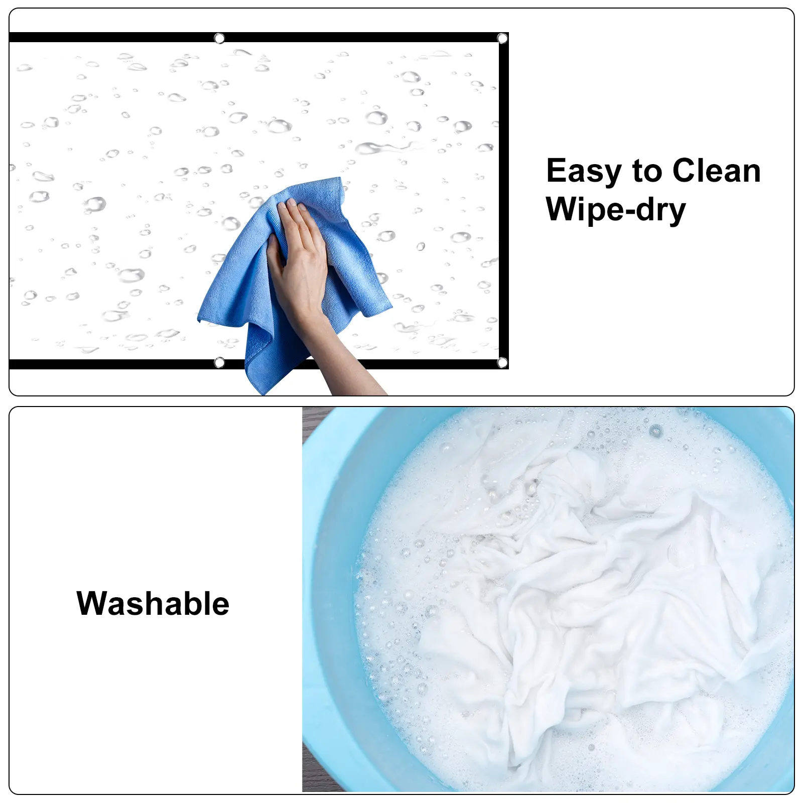 Enjoy a clear, smooth, and crease-free picture on this 100-inch projector screen with a 16:9 aspect ratio and 160° viewing angle. Made from premium polyester milk silk, the screen is thicker, softer, washable, and durable—offering brighter colors and sharper details for both front and rear projection.