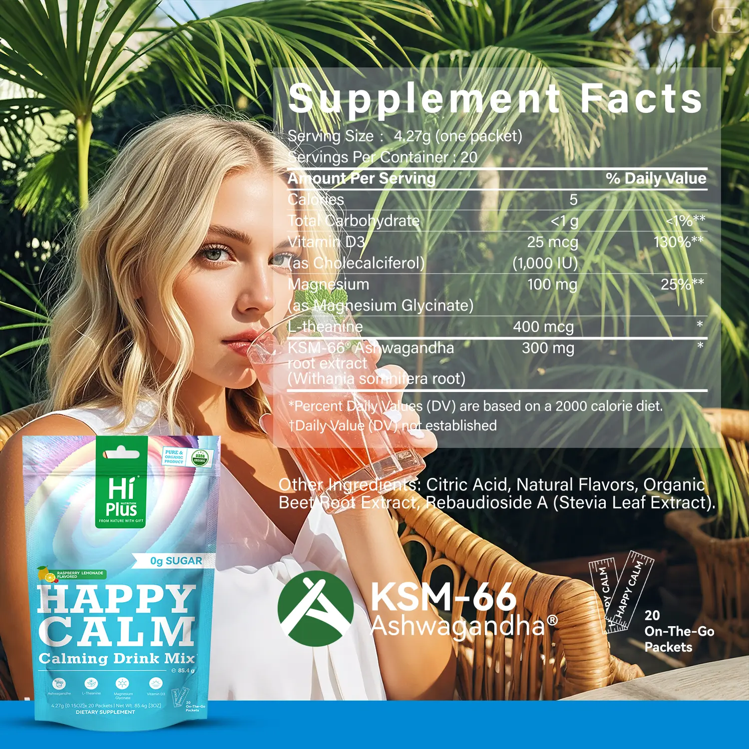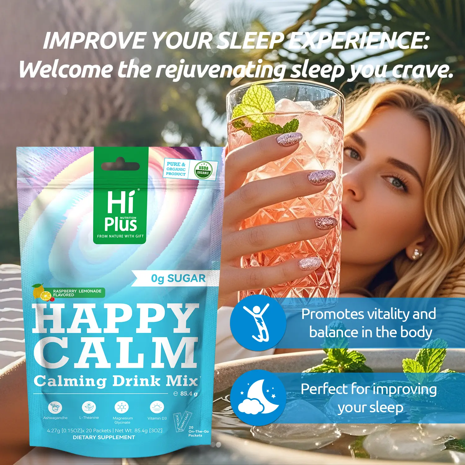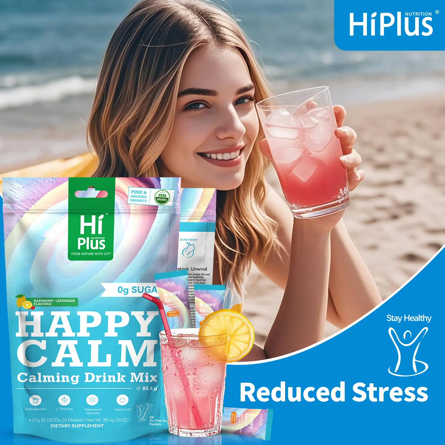 ·Struggling with stress, focus, or sleep? HiPlus® HAPPY CALM is your all-in-one solution for relaxation, mental clarity, and deep sleep. This easy-to-mix raspberry lemonade drink helps you unwind anytime, anywhere—perfect for busy days or restless nights.