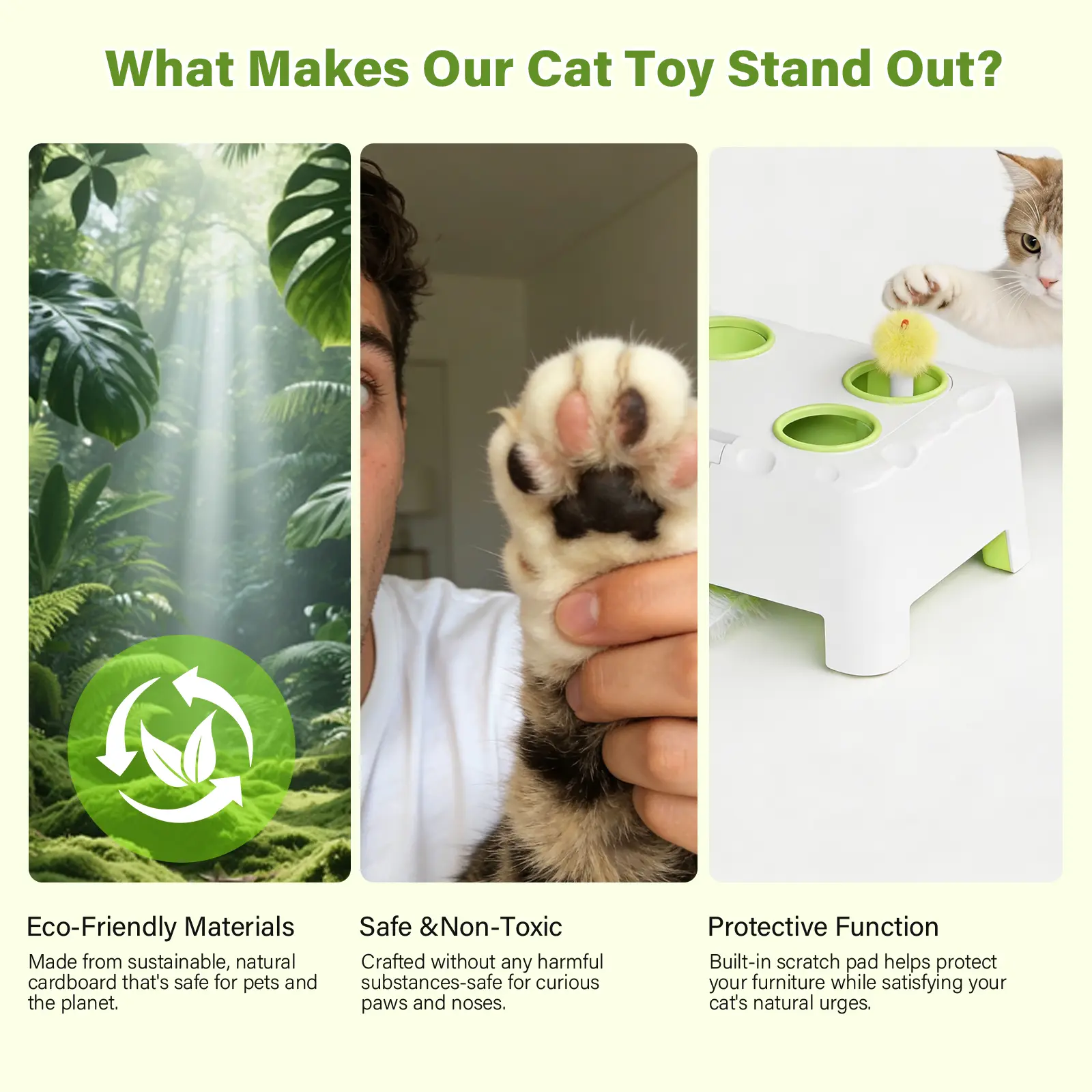 [3-in-1 Multi-Play Design] Combines three engaging play modes â a spinning feather teaser, whack-a-mole hide-and-seek, or both at once â to satisfy cats hunting instincts and keep cats active and entertained indoors