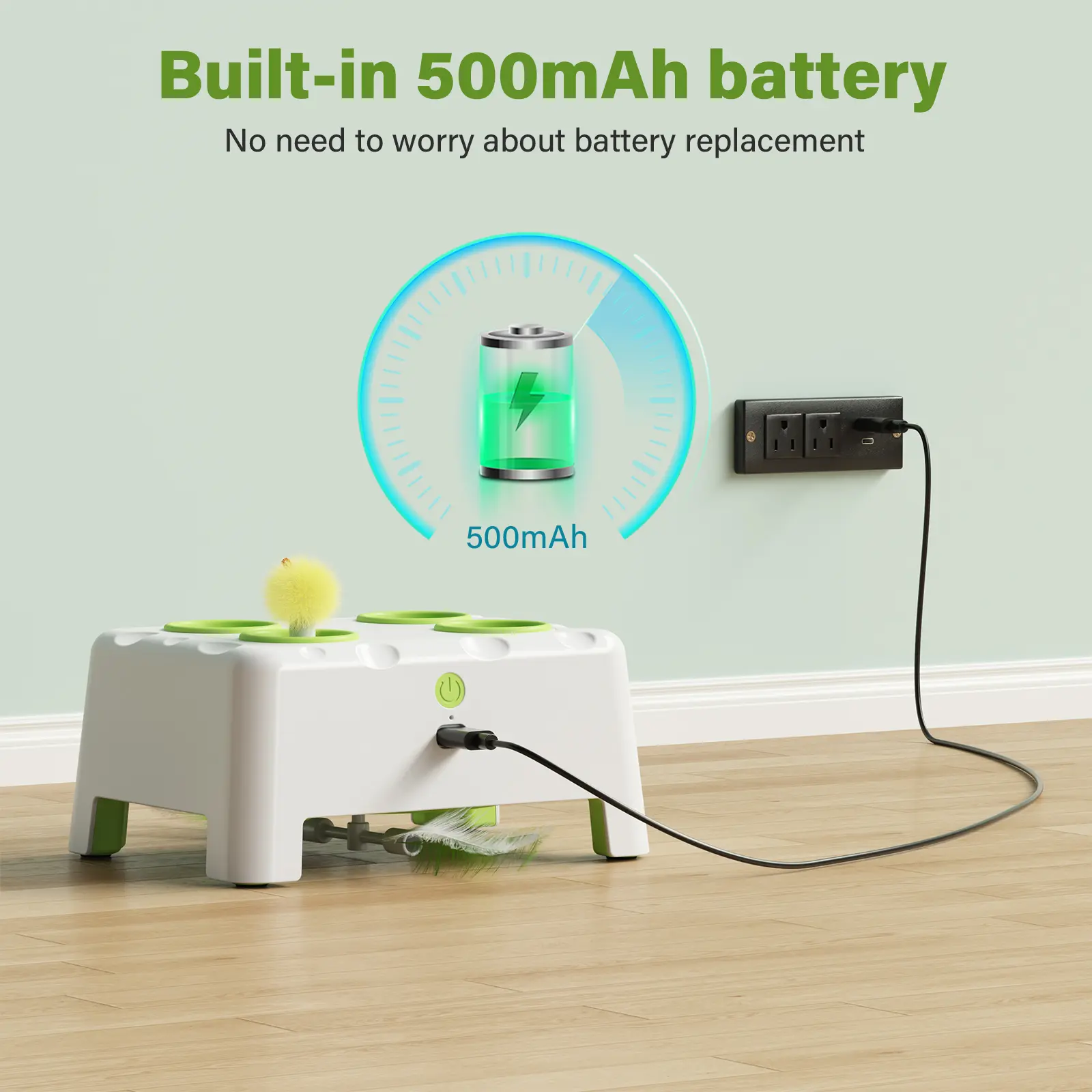 [Rechargeable & Replaceable Fun] Powered by a 500 mAh rechargeable battery for up to 2 hours of play on a single charge. Includes 4 interchangeable attachments (feathers and plush toys) to keep playtime fresh and exciting
