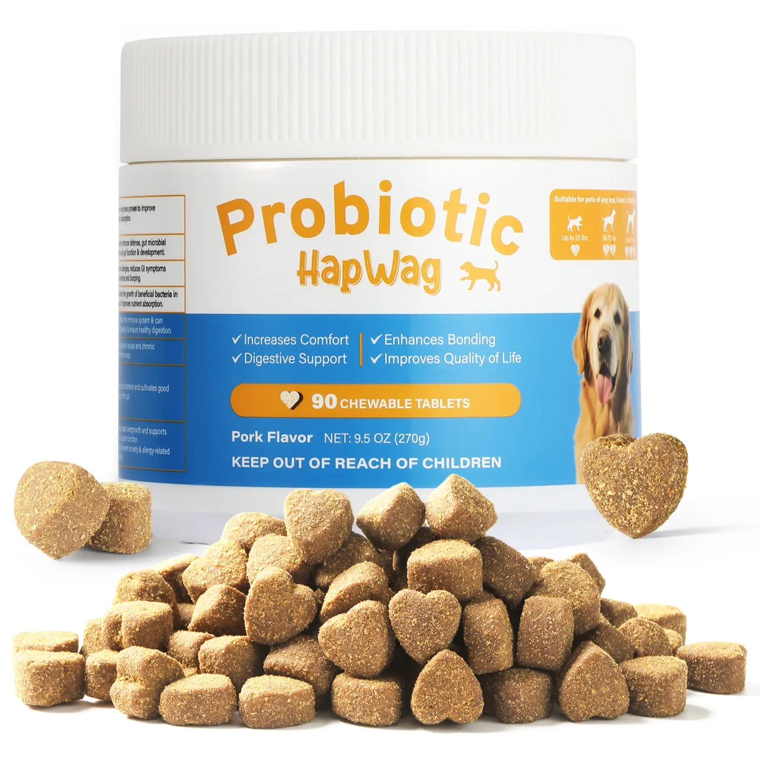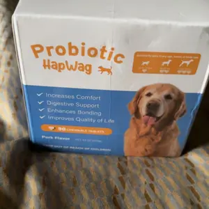 Of course! The HapWag probiotic supplement comes in a container with 90 chewable tablets, flavored with pork, designed to improve dogs’ digestion, comfort, and overall quality of life. I’ve found it easy to use, effective, and well-accepted by pets.