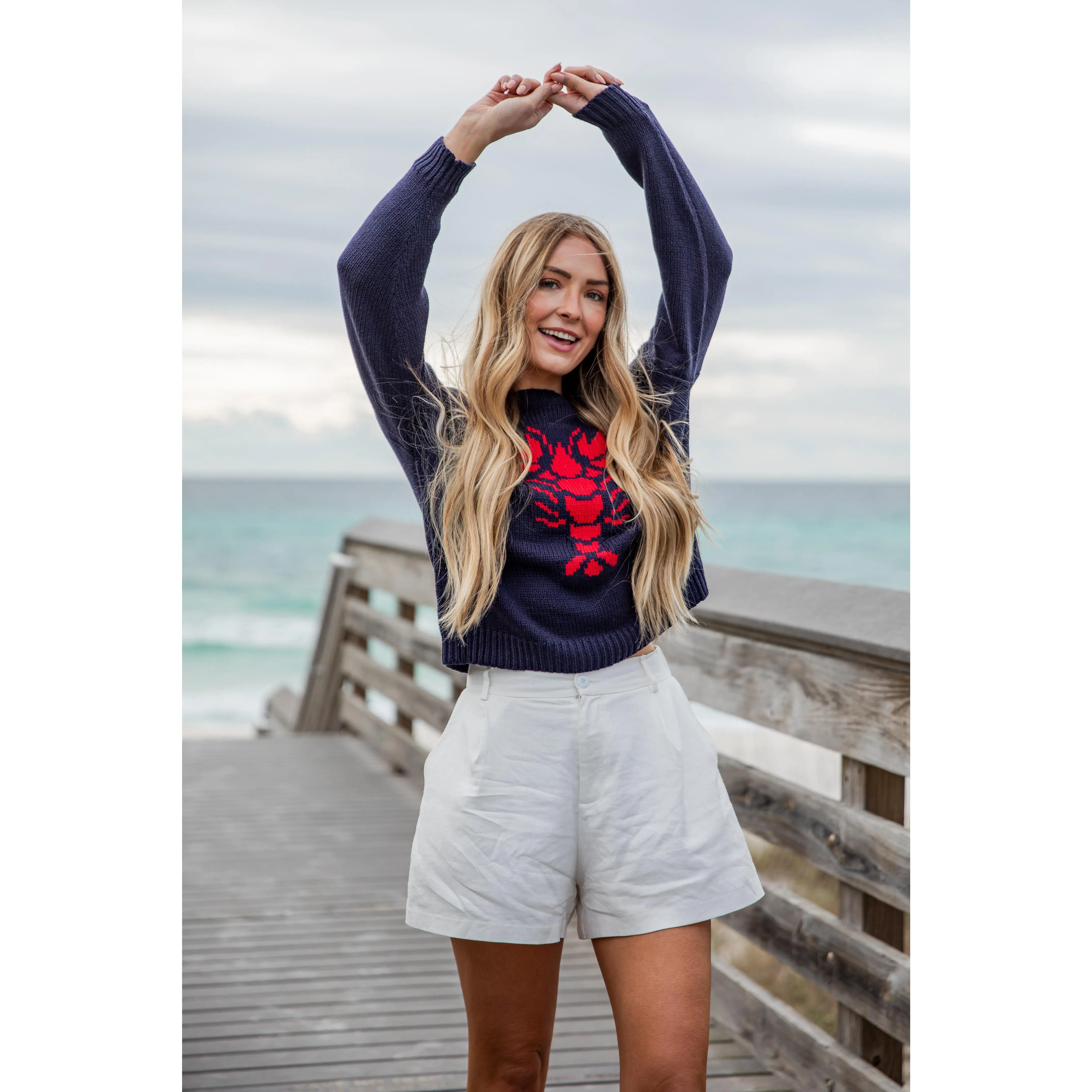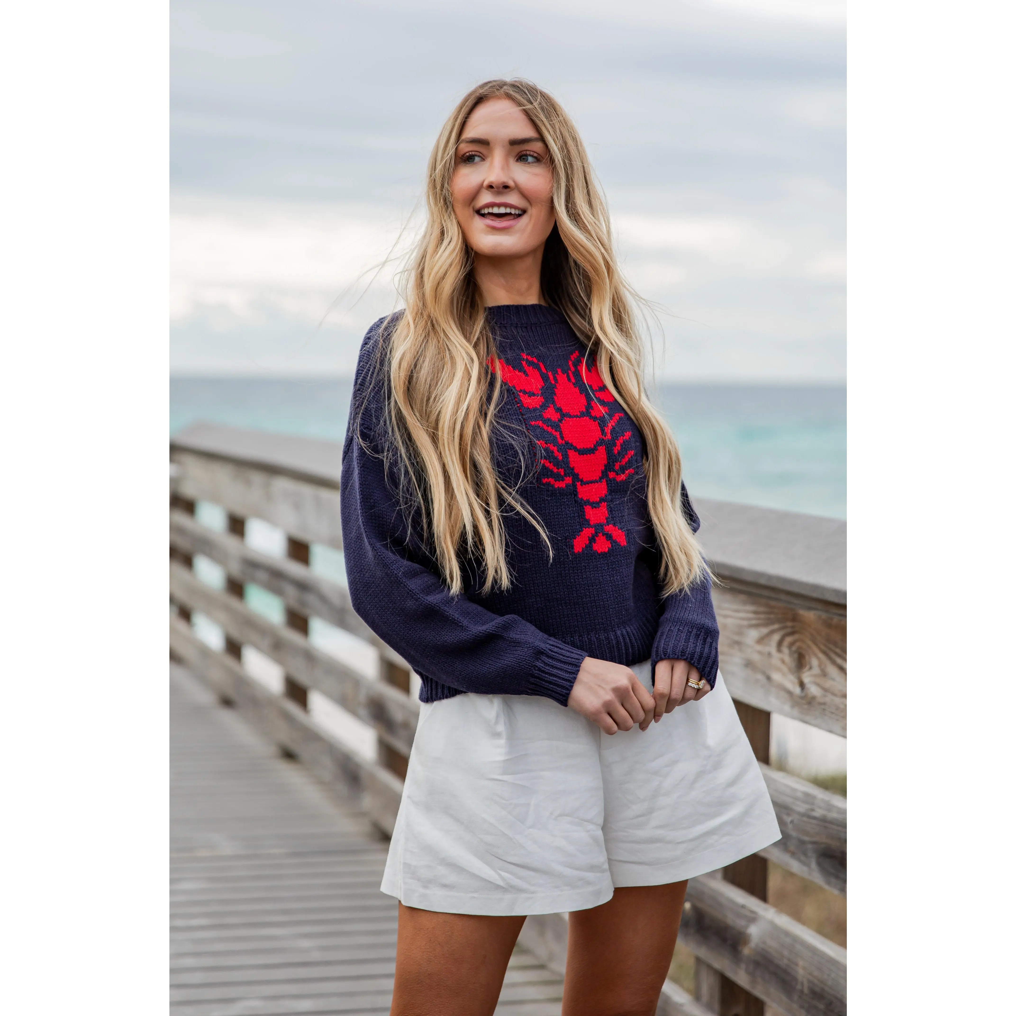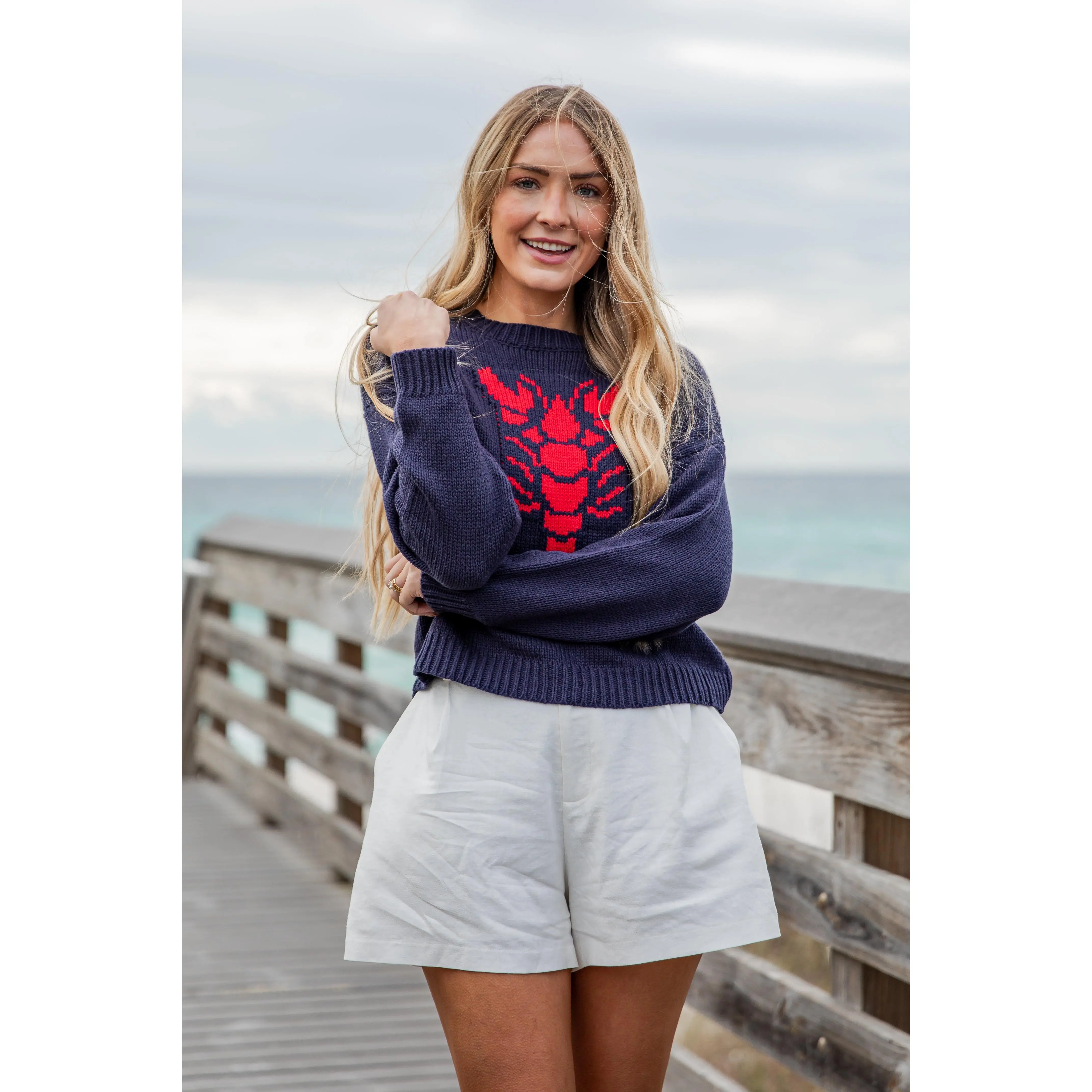 Crafted from a soft, midweight knit, this Harbor Lobster Navy Knit Sweater delivers structure without heaviness. The classic crew neckline, ribbed cuffs, and tailored hem give it a polished silhouette, while the relaxed fit keeps it easy and wearable. The vibrant red lobster adds the perfect pop of color against the deep navy base, creating that effortless maritime aesthetic.