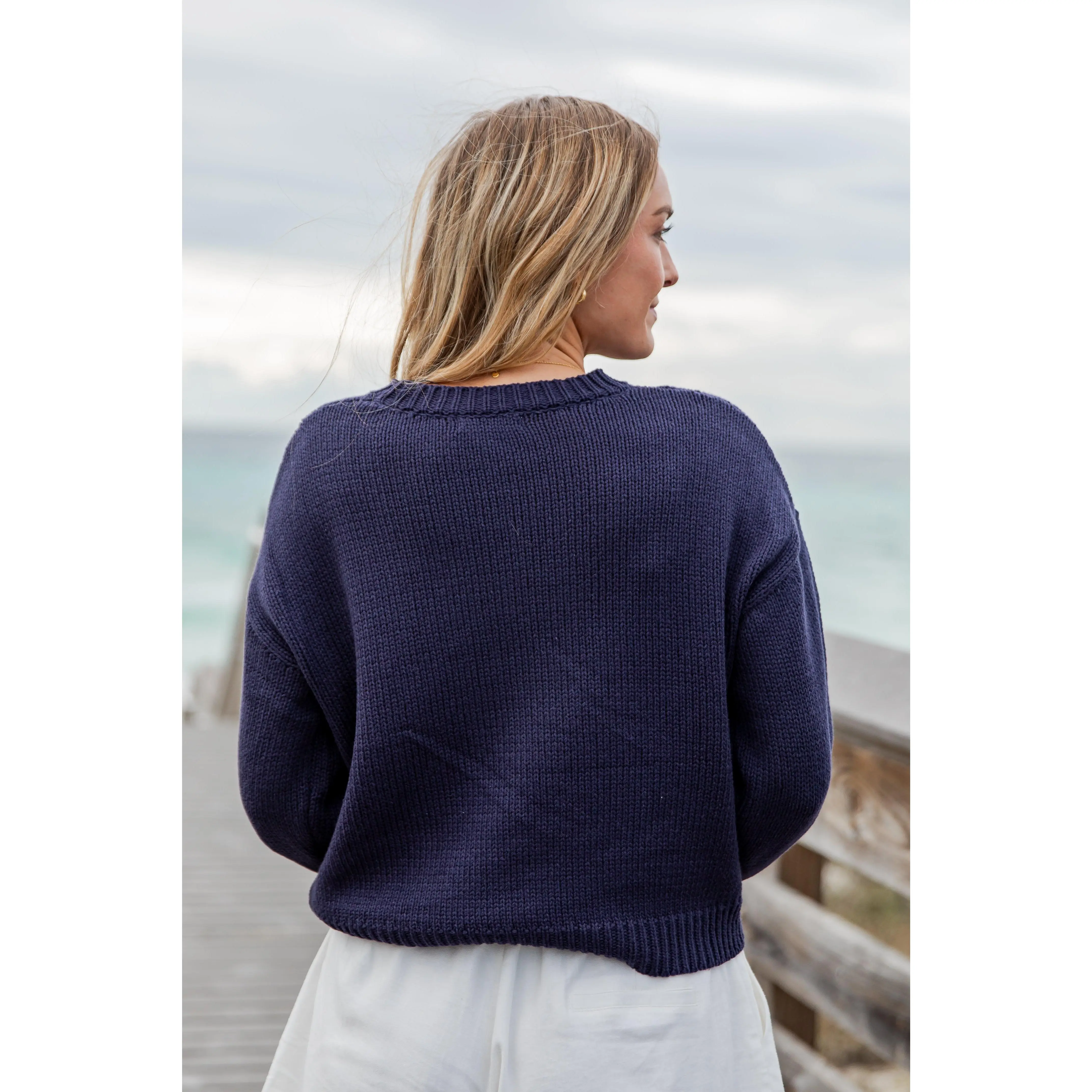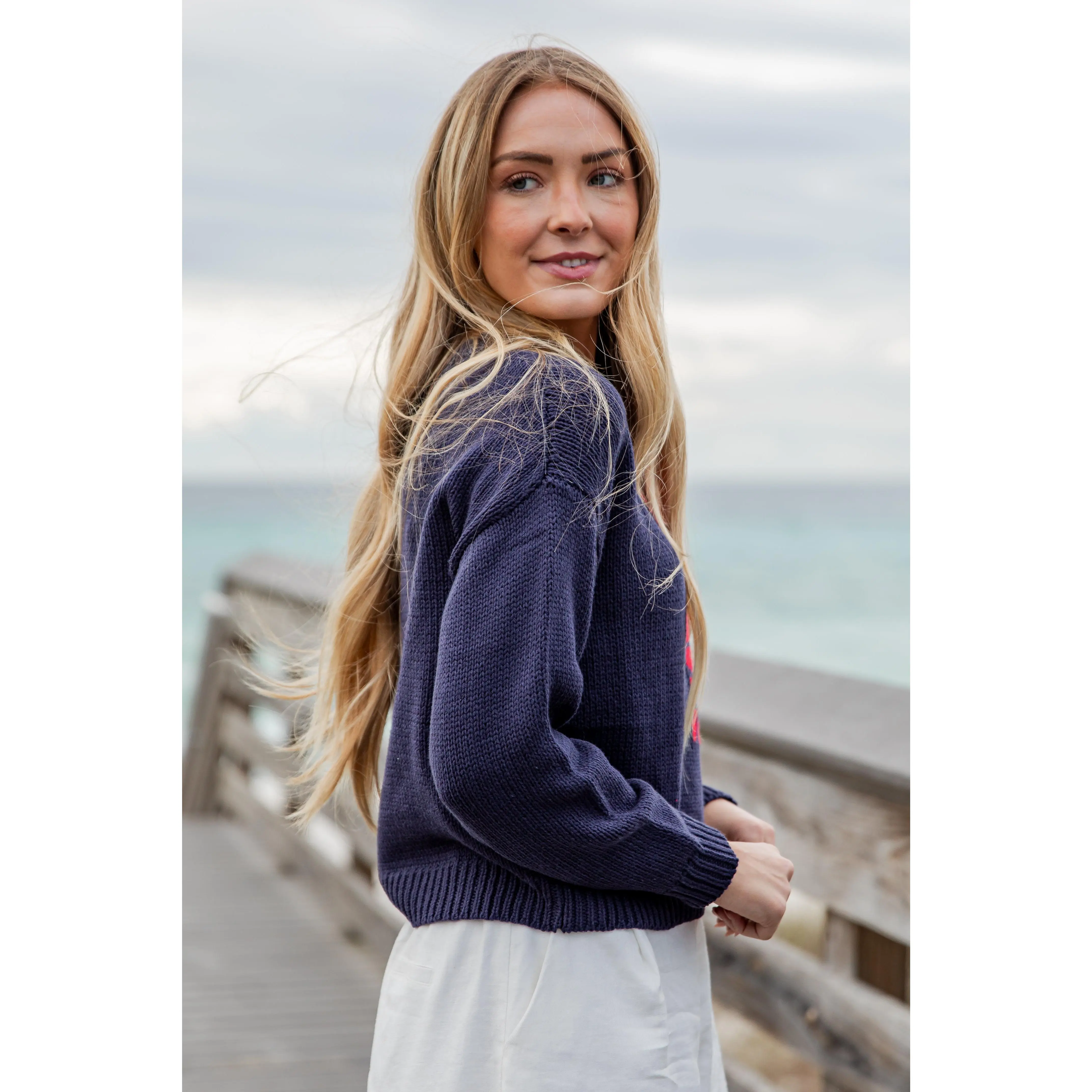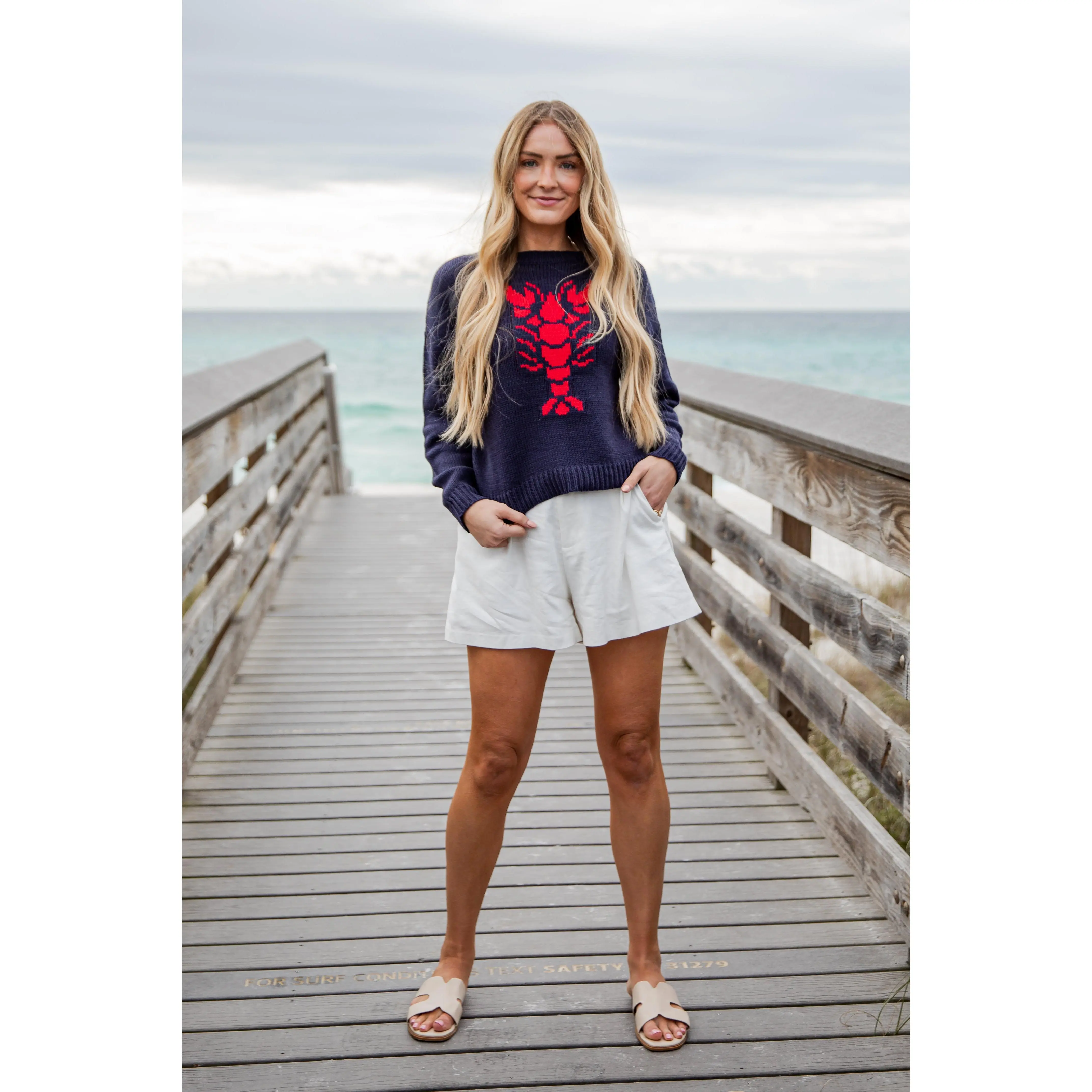 Crafted from a soft, midweight knit, this Harbor Lobster Navy Knit Sweater delivers structure without heaviness. The classic crew neckline, ribbed cuffs, and tailored hem give it a polished silhouette, while the relaxed fit keeps it easy and wearable. The vibrant red lobster adds the perfect pop of color against the deep navy base, creating that effortless maritime aesthetic.